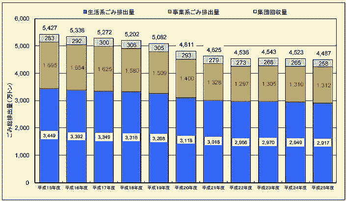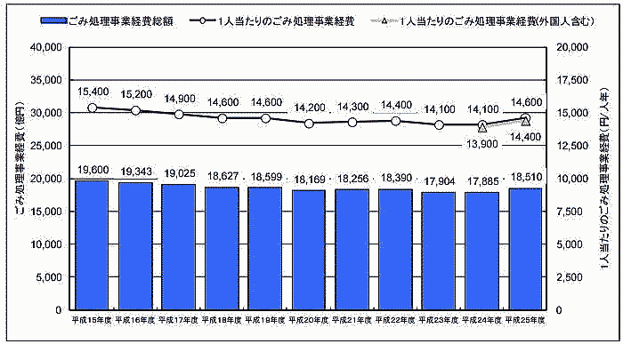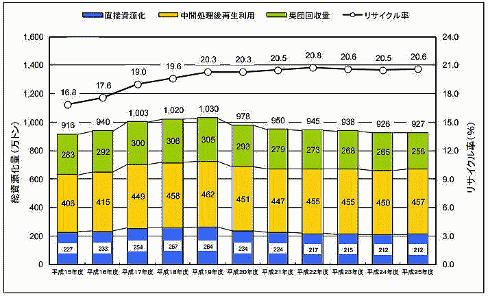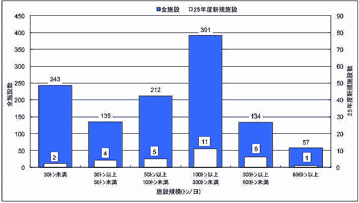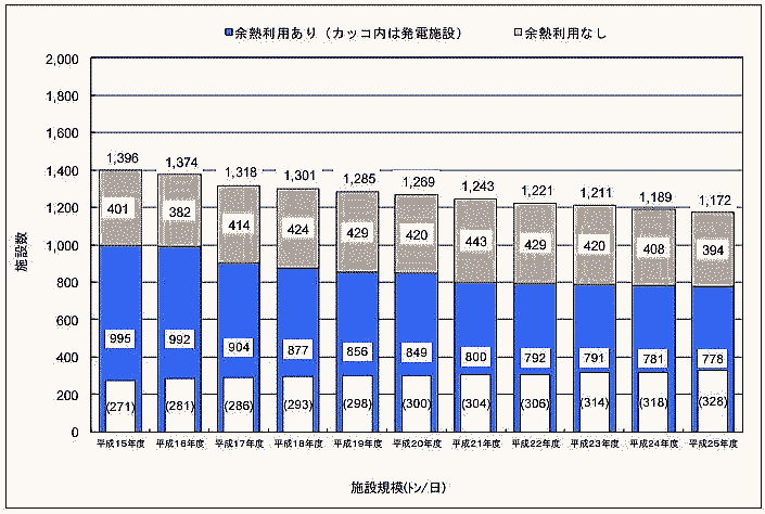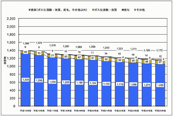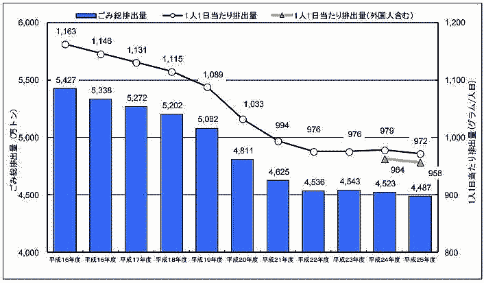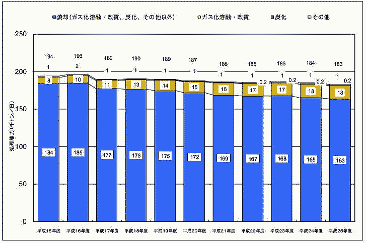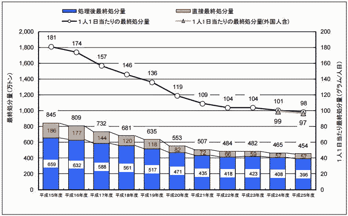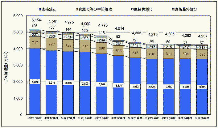 2015年1月末に環境省が発表した「一般廃棄物の排出及び処理状況(平成25年度)」の報告内容について、概説するとともに、日本の廃棄物処理の現状と課題をまとめてみました。 こうした政府の報告書をどう見るか、立場によって異なるとは思います何よりも納税者であり、ごみの排出当事者である国民の視点から考察することが重要です。文中の図はいずれも同報告書から引用したものです。 1.ごみの排出量 日本のごみの総排出量は、平成20年度に年間5000万トンを切って以来漸減し、25年度には4500万トンを下回りました。 ![]() 図1 ごみ総排出量の推移 ごみが減少しているのは、人口が減っていること、そして、市民の意識が高まっていることが大きな理由です。 2.ごみ排出先(事業系、家庭系、集団回収)の内訳 一般廃棄物がどこから排出されるかをみたものです。10年前から大きな変化はありません。事業系一般廃棄物が約30%、家庭系が65%です。平成15年度から25年度の11年間で、事業系廃棄物は23%減少しているのに対し、家庭系廃棄物は15%の減少にとどまっています。一方、集団回収により収集されるごみの量は減少しています。 集団回収が減ったということは、資源として回収されず、ごみとして収集される量が増加したということを示しており、「なんでも燃やせる、燃やす」という焼却依存の傾向が強まっていると言えます。 ![]() 図2 生活系ごみと事業系ごみの排出量の推移 3.処理方法別処理量の推移 次に、収集されたごみがどのように処理されているかです。下図の通り、この11年間で、排出されるごみが焼却処理される割合は78%から80%へと少しずつ増加しています。一方で、資源化等のために中間処理される量や直接資源化される量はまったく増えず、減少傾向を示しています。一方、埋め立て処分量は69%も大幅に減少しています。 ![]() 図3 ごみの総処理量の推移 国や自治体にとって、処分場の延命化が重要課題であるため、廃プラなどの焼却処理が進み、焼却量が増加しています。それによる環境影響については、ほとんど真面目に調査も検討もされていません。松葉を生物指標とした市民参加による調査では、廃プラ焼却後に大気中のダイオキシン類濃度や水銀等の濃度が悪化していることが明らかになっています。 4.資源化についてみると 焼却依存度が高まる中、リサイクルの進展はどうなっているでしょうか。(直接資源化量 + 中間処理後再生利用量 + 集団回収量)の合計量は、平成20年度までは微増していましたが、その後は年々資源化が減ってきています。そのため、リサイクル率は、この11年で17%から21%へとわずか4%しか増加していません。 ![]() 図4 総資源化量とリサイクル率 注10) の推移 排出されたごみの80%以上が「減容」のために焼却されると資源化、リサイクルは進みません。 ![]() リサイクル率は上の式で算出されますが、集団回収のごみ量は、分母と分子の両方に入っているので、それを切り捨てると実際のリサイクル率はもっと低くなります。 集団回収はもとから資源として集めているのでそれを加えるのは問題です。 せっかく家庭で分別しても最終的に焼却施設に持ち込まれることにもなりかねません。 5.ごみ焼却施設は 平成15年度から25年度までの11年をみると、ごみ焼却施設(直接焼却、ガス化溶融炉、炭化炉、その他)の合計施設数は、1396施設から1172施設へと224施設減っています。しかし、直接焼却炉が273施設減っている一方で、ガス化溶融炉は49施設増加、炭化炉が4施設増加、その他が6施設増加しています。 ![]() 図5 ごみ焼却施設の種類別施設数の推移 1993年(平成5年)当時は1854の焼却施設があり、世界の7割の焼却炉が日本に集中していると言われていました。今でも世界における焼却炉の集中度は日本が一番だと思います。ただ、プラントメーカーは政府と一緒になって途上国を中心に焼却炉の売り込みを行っていますのでじわじわ世界における焼却炉の数は増加していると思われます。 6.ごみ焼却施設の処理能力は ごみ焼却施設が全体で224施設(16%)減少しているにも拘わらず、処理能力は、この11年間でわずか11,000トン/日の減少に過ぎず、減少率は5.6%に過ぎません。焼却炉が減った分、ガス化溶融炉が大幅に増加し、処理能力を補っています。 ![]() 図6 ごみ焼却施設の種類別処理能力の推移 焼却炉の大型化、ガス化溶融炉化、灰溶融炉導入などが進めば、その分だけトラブルも増加し、メーカーへの外部委託・依存度も増加するのでコスト的には増加します。 7.焼却炉の規模は 国内の焼却炉を規模別に見ると、100〜300t/日の規模が最も多く、次いで30t/日未満と、規模が小さい焼却炉が多くなっています。 ![]() 図7 ごみ焼却施設の規模別施設数 合併や広域連合、一部事務組合等のもとでのごみ処理施設の大型化が進んでいますが、まだまだ小規模な焼却炉が多いのが実態です。 環境省の「循環型社会形成推進交付金制度」のなかに、「廃棄物処理施設における長寿命化計画策定支援事業」という