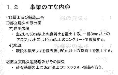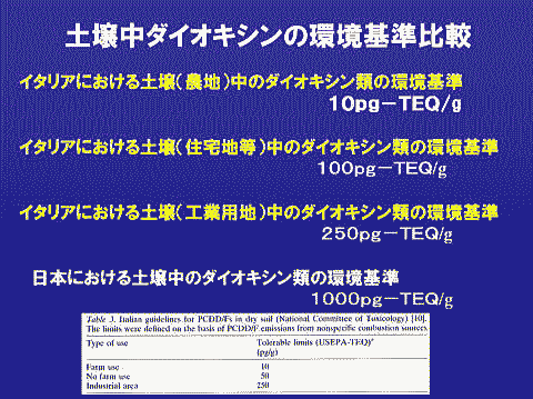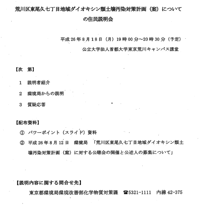 500人ほど入れる首都大学東京荒川キャンパスの講堂ですが、何と青山が目視で調べたところ、東京都、荒川区の役人などを除外した住民の参加者は、高齢者の男女ばかり30〜40人ほどでした。500人の会場に30〜40人しか参加していない理由は上記のように東京都側が説明会を一方的かつ地域の実情をまったく勘案せずに決めたことにあります。下は閑散としている会場の写真です。 ![]() 写真 会場の様子 しかも説明会の開催は一回のみ、さらに当日は全体が1時間半のうち、実質1時間が行政側の説明、それも分かり憎い説明で、住民からの質問はわずか30分、さらにその半分は都側の回答でした。そして8:30を少し過ぎたところで終了宣言となり、集まった高齢者の住民はいずれも怒り心頭となりました。目黒から車を飛ばして開催直前に到着し参加した池田、青山も東京都の誠意のなさ、意図的に開催したというアリバイ作りのやり方に怒り心頭となりました。 ![]() 当日、東京都から配布された次第 さらにわずか一回しか開催しない説明会の直後の8月下旬に公聴会を開催する、しかもひとり10分、10人のみ多い場合は抽選と言い出したことで,住民達はさらに怒り出しました。公聴会に公述人として応募できるのは周辺地域に居住、在勤している人に限られています。都立公園であるにもかかわらずです。 上記はあくまでも手続き論についですが、内容にいたっては、杜撰そのものでした。住民がもっとも知りたがっていた日本でおそらく過去最高の高濃度ダイオキシン汚染の原因については、当初の説明では全く触れず、30分の質疑の中で2人に住民が食い下がったところ、最後に担当者が口頭で少しだけ話すだけでした。 また対策は、まさに「臭いものに蓋」そのもので、公園部分の表土(地表から5cmまでの土壌)で1000pg-TEQ/gを超えている場所だけに、汚染土壌の上から50cm土壌をかぶせる、すなわち覆土する/アスファルトで覆うだけと言う安易なものです。 ![]() 当日、東京都から配布された対策計画資料より 以下の配付資料上は公園部分の対策箇所。横線が入っている部分、3箇所を覆土するだけです。当然、これには住民から、後から他の箇所で1000pg-TEQ/gを超える箇所が発見されたらどうするんだ! という質問が出ました。 ![]() 当日の配付資料より 下図は、公園の覆土のエッジ部分です。何とアスファルト舗装した上に覆土するだけの安易な構造です。 ![]() 当日の配付資料より もとより、東京都はたまたま見つかった1000pg-TEQ/g以上の公園の土壌しか対策の対象としていません。しかし、1000pg-TEQ/gという環境基準は、1999年時点、日本中がダイオキシン汚染まみれとなっていた時期に、所沢ダイオキシン事件そしてテレビ朝日報道ががきっかけとなり、ダイオキシンル対策特別措置法のなかで設定された環境基準です。しかも、自民党政権下、いやがる自民党を当時の公明党が説き伏せ、基準をすべて緩くして通した議員立法なのです。 ちなみにドイツ、イタリアなどではこどもの遊び場は100pg-TEQ/gとなっています。EU諸国より10倍緩い基準を金科玉条に、東京都の課長が説明する姿は実に滑稽ですらありました! ![]() 出典:青山貞一、北イタリア・セベソ〜化学工場大爆発による ダイオキシン飛散事故から30年〜現地視察(検証)概要報告書 2006年3月 ドイツもほぼイタリアと同じ、さらにその後EU指令としてEU諸国の指針となっている! <参考> 青山貞一(武蔵工業大学環境情報学部 、池田こみち(環境総合研究所) セベソのダイオキシン大事故から30年:イタリア、EUはセベソから何を学んだか〜現地調査を踏まえて〜 もし、イタリアやドイツの基準(100pg-teq/g)で荒川区東尾久のダイオキシン汚染の対策を行うとすれば、ほとんど全地域が対象となるはずです。 会場の区民から、「ダイオキシンと言えば猛毒ですよ。そんな簡単な話じゃないでしょう。どうなんですか。」などと声が飛ぶと、壇上の環境局の課長は、しばらく逡巡してから「猛毒とも言われています」とオドオドしながら返事をしました。 ダイオキシン類に対する環境基準やその毒性に対する考え方がそんな程度であれば、およそ区民のことを考えた対策などができる訳もありません。お粗末を通り越しています。 当然、大降雨などがあれば、上部から地下にダイオキシンや重金属類が浸透するのに、帯水層の位置や不透水層の位置などについての説明はゼロ、青山がしつこく聞いたら、後日請求して欲しいというのみでした。 池田が昨年確認したところ、地下水からも1.1pg-TEQ/Lのダイオキシンがでていることがわかりました。しかし、排水基準の10pg-TEQ/Lで評価したとのことでその時点で汚染を隠蔽しようとする体質が明らかと感じました。その後、地下水の流向を調査し隅田川方向に流れていることがわかったので水処理装置をとりつけたとも話していました。こうした事実については、説明会では全く触れていませんでした。何故かと言えば、それはダイオキシン特措法の対象外である