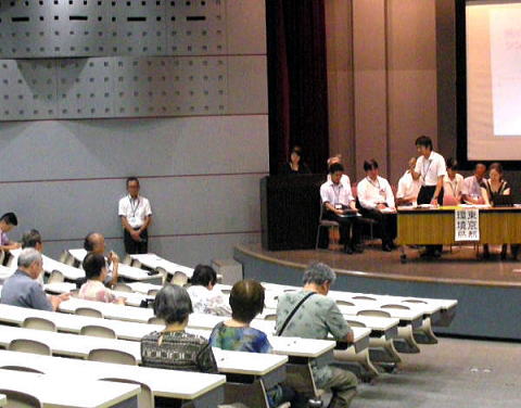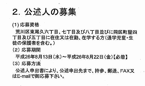 私達は60年以上永年東京都に住み、研究所も30年間東京都内にあることから住民税、法人事業所税を払ってきた東京都が相手なので、徹底的に役人らのいいかげん、かつ無責任な言動に逐次、青山、池田で批判を加えました。 質疑時間はほとんどなく、わずか1回しか説明会を開催しない、しかも上述の公聴会の公述人は荒川区の一部住民だけということ(以下参照)で、青山、池田がその場で質問しようにも時間がありませんでした。できるだけ参加された地元の皆さんに質問して頂きたいとの配慮からです。 ![]() 当日の配付資料 そこで、青山、池田は最後部に座っていたのですが、住民の質問を補完・応援する形で、大声で東京都側に質問や批判をその都度しました(笑い)。住民はおもわぬ援軍がいたことでびっくりするとともに、その都度、喜んでいました。 今後、8月末に公聴会を開催したあと、おそらく一気に約1億円の経費をかけ、上記の覆土工事に移るのでしょうが、その工事の具体的内容も示されませんでした。これで11月からいきなり工事に入るようです。 ![]() 当日の配付資料より 本来、汚染土壌をすべて掘削し最終処分場などに移動すべきなのに、東京都は部分的な覆土だけでお茶を濁しているのです。それに手を貸しているのがおよそダイオキシン類の研究者でもない御用学者であると言えます。これについても指摘しました。 7月末に開催された環境審議会土壌水質部会では、アデカに対する対策費用の負担額なども協議されており、ほどんど東京都のシナリオ通りにことが進んでいるにもかかわらず、「汚染原因については、現在審議会で検討頂いているところでまだ結論は出ていませんが、アデカの化学工業の製造プロセスを原因とするものがあるということが指摘されております」などと煮え切らない発言をするので説明会がますます混乱することになりました。 ![]() 地域住民の質問に答える東京都環境局の課長 少なくとも、環境審議会がすべて終了してから、その議論を説明し、対策計画を立案して説明するならともかく、審議未了のものを先に住民に説明するというのも本末転倒です。 また、二言目には、「このようなお盆休み明けに説明会を開催したのは、荒川区さんから早く適切な対策を講じ、公園の再開を進めてほしい、とのご要請がありましたのでそうした要望を踏まえてできるだけ早く説明会を開催し、工事に着手したいためであり、ご理解頂きたい」を何度となく繰り返しました。 荒川区が東京都にこうした要望を出したことが利用され、住民は「なぜそんなに早くやる必要があるのか、当初は汚染が発覚してから半年以上も住民に公表せず問題を隠蔽してきたにもかかわらず。。。」と批判が出ました。 つまり、東京都は一切地域住民や都民のことを考えず、一方的に役所の都合と汚染原因者であるアデカとの合意形成、費用の軽減と工期の短縮のみを重視してこの重大な土壌汚染問題を見せかけ的に解決しようとしているに他なりません。 これまで4回地元では説明会を開催しているようですが、初めて参加される方もいらっしゃるはずだ、ということを考慮して、汚染の実態から説明し、汚染原因の究明の現状を説明し、対策方法についてのいろいろな代替案を説明し、なぜ掘削除去ではなく覆土/コンクリートによる固化を選択したのか、など順序立てて説明すべき所、いきなり、掘削除去にはお金と時間がかかり、他の土壌汚染地域の前例を参考にして覆土/コンクリート固化が最適な方法と説明を繰り返しても説得力は皆無でした。 一から顔を洗って出直す必要があります。 天下の東京都がすべてを審議会の責任、国の法律がこうなっている、といった言い分けや責任転嫁ばかりしていては行政の責任は果たせません。法律を踏まえつつも、東京都独自の制度、考え方を新たに打ち出すなど、そうした汚染土壌を内包する工場跡地を買っては住宅地や公園にしてきた事業者としての責任を果たすべきです。 荒川区の現地は、下町の住宅が密集する場所で、小学校など学校も多く、汚染が発覚してからも多くの子供たちやお年寄りが公園で遊び、憩い、区民に親しまれてきた場所です。こうした場所を覆土して早く開放することが区民にとっても望ましい、と一方的に考えることこそ行政の傲慢に他なりません。 以下は2014年8月19日夕方、池田こみちが電話で東京都環境局にヒヤリングした内容です。