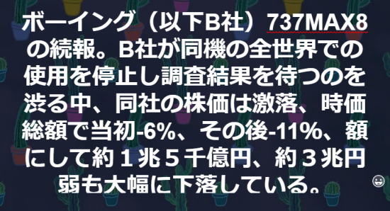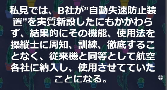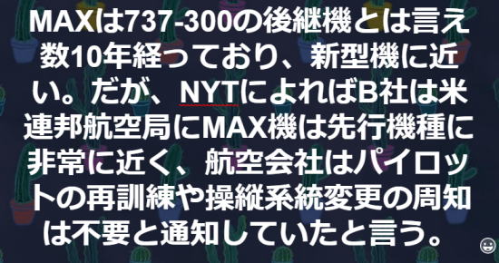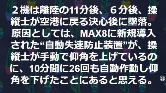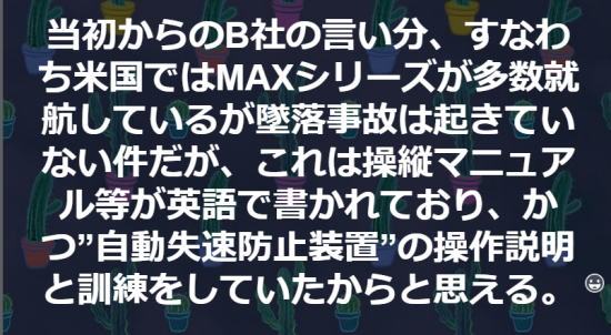 | (1) (2) (3) (4) 以下は青山論考(1)の原因に関連する部分の再掲載です。, その後、先に墜落したライオン・エア事故ではフライトレコーダーが回収され、テイクオフ(離陸)から墜落するまでの11分間について詳細な時系列的分析が行われた。 , “フライト・レコーダー”によると、「パイロットの機首上げ指令(操縦舵輪を引く力)」、「MCASの機首下げ指令(操縦舵輪を押す力)」、「操縦舵輪の位置」、「機体の迎え角(AOA)センサーの値」、「フラップの位置」等を時系列で示し、タキシング中から離陸、上昇、墜落までの11分間の経緯を正確に示している。 , その結果、ボーイング737MAX8機に新らたに設置されたの“失速防止装置(anti-stall flight- control system)”は、パイロットの力に抗し、墜落するまでの10分間に26回も繰り返し“機首下げ指令”を出し続けていた、ことが分かった。 今まで分かったこととして、今回の2つの航空機事故の原因と考えられるのは、以下の3点ではないかと考え得られます。 , 1.ボーイングが737 MAXに取付けた「MCAS」/「失速防止装置(anti-stall flight- control system)」の設計上の問題およびそのシステムについてのエアラインに対する説明不足。 2.ライオンエア・パイロットのシステムに対する理解の不足、特にシステム故障の際のシステム遮断の方法。 3.ライオンエアの整備が前便で生じていた「迎え角センサー(AOA=angle of attack sensors) の不具合を修理せずに出発させたこと。 , となっている。 しかしの“失速防止装置をボーイング737MAX8機(実際はMAX7,8,9など複数の後継機種に設置している)に新設しながら、その新システムに問題があったとすれば、ボーイング社の責任は免れない。 パイロットのシステムに対する理解の不足と言っているが、そもそも新設システムの使用がパイロットに容易に理解できないようなシステムであるなら、それ自体が大きな問題であろう。 以下は青山論考(2)です。 ![]() ![]() 以下はエアバス社の失速防止装置のテスト動画です。ちょっと見ただけではわかりませんが、時間とともに先方の風景から次第に航空機の頭部が下がってくるのが分かります。 Test Anti stall system A320 (Aerosoft Airbus) - YouTube ![]() ![]() ![]() (3)につづく |