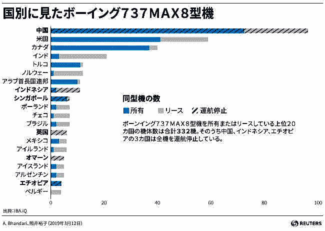 中国民用航空局は、エチオピア航空の事故を受けて、中国南方航空、中国東方航空などをはじめとした全ての中国国内の航空会社に、ボーイング737MAX8型機での運航を緊急で停止させた。また、欧州連合(EU)の欧州航空安全局(EASA)も、欧州空域での同型機の運航を禁止すると発表した。他にも運用を禁止している国がある。