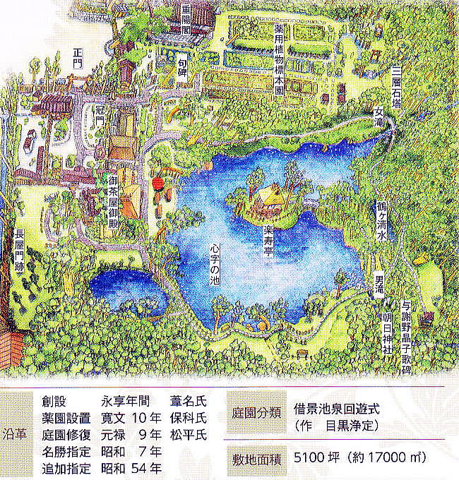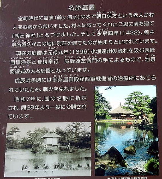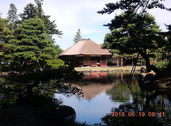 | <総合メニューへ> 久々の会津若松 御薬園 1 御薬園 2 日新館 はじめに 概要・歴史 学習・自習 大学・資料室 武術・天文台 仏都会津の三霊地巡り 中田観音 立木千手観音 鳥追観音 2018年6月17日~19日、青山貞一、池田こみちは、2011年3月11日以降の東日本大震災、津波、福島第一原発事故による影響、被害の復旧・復興状況を調査するため福島県内の調査を実施した。 調査が一段落した6月19日、私たちは今まで訪問していない会津若松の歴史文化の拠点を訪問することにした。 6月19日午前、最初に訪問したのは、宿泊先旅館からほど近いところにある。この日は超がつく好天。会津は盆地で暑すぎるくらいだ。 御薬園、〒965-0804 福島県会津若松市花春町8?1 ![]() 出典:グーグルマップ ![]() 出典:グーグルマップ ![]() 出典:御薬園 入園時にいただくパンフの表紙 下の地図は、パンフにある園内の案内図である。正門は地図中、左上にある。 ![]() 出典:御薬園 入園時にいただいたパンフにある案内図 御薬園(おやくえん)は、福島県会津若松市にある日本庭園で会津松平氏庭園として国の名勝に指定されている。下はその御薬園の入り口である。 ![]() 撮影:青山貞一 Nikon Coolpix S9900 ![]() 出典:Wikimedia Commons ![]() 撮影:池田こみち Nikon Coolpix S9900 ![]() 出典:御薬園 入園時にいただいたパンフにある重陽閣 下は秩父宮妃勢世子氏のレリーフ。 ![]() 撮影:青山貞一 Nikon Coolpix S9900 歴史 御薬園の起こりは、室町時代に霊泉の湧きだしたこの地に、永享4年(1432年)、蘆名盛久が別荘を建てたのがはじまりといわれている。 その後の江戸時代の寛文10年(1670年)、会津藩2代藩主保科正経が領民を疫病から救うために園内に薬草園を作り、3代藩主松平正容が貞享年間に朝鮮人参を試植し、その栽培を民間に広く奨励したことから、それが名前の由来となっている。 現在の庭園は、元禄9年(1696年)、松平正容が園匠の目黒浄定を招き、小堀遠州の流れをくんだ本格的な大名型山水庭園に大改造したもの。園内の楽寿亭や御茶屋御殿の建物は、戊辰戦争時に新政府軍の傷病者の診療所とされたため、戦火を免れた。 昭和7年(1932年)10月19日に、江戸時代の代表的な大名型山水庭園として優秀なものとして国の名勝に指定された。昭和54年(1979年)6月25日には旧薬園跡、池水取入口などが追加指定された。 以下はパンフにみる御薬園の主な歴史。 ![]() 出典:御薬園 入園時にいただいたパンフにあった主な歴史 ![]() 撮影:青山貞一 Nikon Coolpix S9900 概要 御薬園の敷地面積は約1.7ha。中央に心字の池を配し、その中央に亀島と楽寿亭を置き、池辺には巧みに石を配し、池への流水路として女滝、男滝を置く。 ![]() 撮影:青山貞一 Nikon Coolpix S9900 ![]() 撮影:池田こみち Nikon Coolpix S9900 下は庭園の解説。 ![]() 撮影:青山貞一 Nikon Coolpix S9900 園内に多くのモミ、スギ、マツの大樹老木を配置し、キャラボク、ゴヨウマツの古木を点植し、回遊園路を設けた、東側の背炙山の連山を背景とした借景池泉回遊式庭園である。 心字の池西側には御茶屋御殿があり、茶会などに利用されている。庭園北側には藩政時代の薬草栽培地跡を利用した薬用植物標本園があり、会津産薬草約200種を含め約400種の薬草が栽培されている。 下は心字の池の中央にある楽寿亭。 ![]() 心字の池の中央にある楽寿亭 撮影:青山貞一 Nikon Coolpix S9900 ![]() 撮影:青山貞一 Nikon Coolpix S9900 つづく |