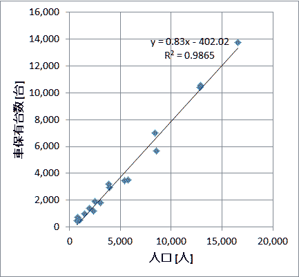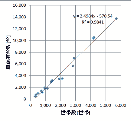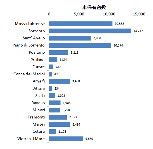注2)住民一人当たりの平均年収( Reddoi Medio)は2010年の値、1ユーロ=110円で換算。 出典 http://www.comuni-italiani.it/065/index.html 出典 http://www.comuni-italiani.it/063/index.html ●自動車保有台数 図8は、アマルフィ海岸自治体の自動車保有台数である。対象地域は、半島の北側に鉄道があるだけでアマルフィ海岸側には鉄道も高速道路も存在していない。おそらくその状況は9世紀から現在まで変わっていない。 ![]() 図8 アマルフィ海岸自治体の自動車保有台数 出典:青山貞一・池田こみち、南イタリア・アマルフィ海岸自治体の基礎調査データ② また以下の図8と図9は、自動車保有台数と世帯数、人口との相関係数グラフである。当然のことであるが世帯で0.9865,人口で0.9904と相関が高いことが分かる。
