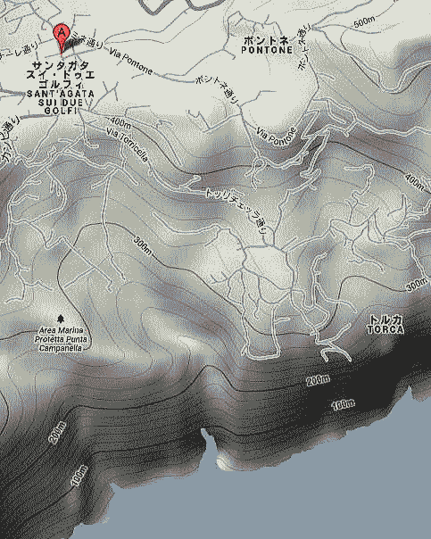 2013年アマルフィ海岸現地視察調査報告<125本 全体メニュー> アマルフィの位置 マッサルブレンセの紋章 イタリア国旗 <4>日程・訪問先別ハイライト(2013年6月6日 その3 Torca) 最初に、訪問先別の秀逸で希有な景観を写真でブログ風にご紹介しましょう。ソレント半島及びアマルフィ海岸の景観は、単なる自然の美ではありません。9世紀以来、持続する歴史や文化に彩られた空、海、地形によって醸成された希有で秀逸そして洗練された美があります。しかも、そこには慎ましやかな住民の生活と小規模自治体の競争的分権の連携があります。 ◆トルカの断崖絶壁とクラッポラ海岸 2013年6月6日 マルチャーノ教会を後に、私達はマッサ・ルブレンセの集落、テルミニ(Termini)、またマッサ・ルブレンセにおける交通の要所、サンタガータ(Santa Agata)を経由し、次の宿泊地、フローレ(Furore)に向かうことにしました。 ただ、すぐにフローレに向かうのは時間的に早すぎるのでサンタガータを過ぎた頃、まずは朝食時につくったサンドウィッチの弁当をいただく場所を探しました。 地図上で探したのが、下の地形図にありますトルカ(Torca)というサンタガータから南に数km行ったところにある小さな町です。 実はソレント半島の南側で、アマルフィ海岸が始まる前の地域は下の3次元地形図にあるように、厳しい断崖絶壁が続いており、市民が海水浴が出来るビーチは、ネラーノのカントーネ海岸(Marina del Cantone)くらいしかありません。下の地図では▲------------------▲ |