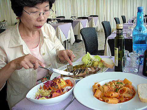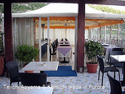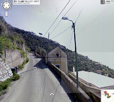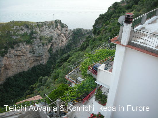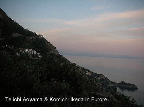 2013年アマルフィ海岸現地視察調査報告<125本 全体メニュー> アマルフィ海岸の位置 フローレの紋章 イタリア国旗 <4>日程・訪問先別ハイライト(2013年6月6日 その5 フローレのレストラン) 最初に、訪問先別の秀逸で希有な景観を写真でブログ風にご紹介しましょう。ソレント半島及びアマルフィ海岸の景観は、単なる自然の美ではありません。9世紀以来、持続する歴史や文化に彩られた空、海、地形によって醸成された希有で秀逸そして洗練された美があります。しかも、そこには慎ましやかな住民の生活と小規模自治体の競争的分権の連携があります。 ◆フレーレのB&Bと断崖絶壁上のレストラン 2013年6月6日 この日の宿泊はフローレ(Furore)です。 ところで、私達は、夕暮れ近くプライアーノを通過し、その直後にフローレ村の入り口となる Marina di Praia を通過しました。しかし、車でフローレ村に行くには上述のように、隣まちのコンカ・デイ・マリーニまで行き、アマルフィ側から180度曲がり、フローレ村に入らなければなりません。このコースは上り坂がかなりの傾斜があり運転も大変です。 下の写真は、傾斜をかなり登ったところから見た夕暮れのコンカ・デイ・マリーニの岬です。岬にはトーレ(要塞・見張り台)があります。 ![]() 撮影:青山貞一 Nikon Coolpix S8 コンカ・ディ・マリーニからフローレのFiordoの切り込みまで戻ってくると、背後の山の上にホテルが見えました。このホテルは私がちがこの日宿泊するB&Bではありまえせん。 ![]() 撮影:青山貞一 Nikon Coolpix S8 下の写真は、コンカ・ディ・マリーニの岬(Punta di Conca dei Marini)と上の写真を一枚の写真におさめたものです。夕闇がグラデーションになってすごく綺麗です。 撮影:青山貞一 Nikon Coolpix S8 この後、何はともあれ今日宿泊するB&Bを探しました。これがなかなか見つかりません。結局、フローレの曲がりくねった崖上の道を東端からコンカ・ディ・マリーニ(Conca dei Marini)近くの西の端まで数回行き来きしましたが、見つかりません。 東京で作成した宿泊先への道順をしるしたパワーポイントにある以下のストリートビューの写真を再度チェックした結果、Fiordoの崖上にある類似のカ所を降りてみようと言うことになりました。その結果、目的に行けたのですが、問題は以下のストリートビューの撮影が相当古く、現地の今の様子とかなり違っていたことが原因であることが分かりました。 ![]() このストリートビューは撮影時期が古く、現状とかなり違っていました! 出典:グーグルマップ ストリートビュー 次のチェックポイントは、下のストリートビューです。真ん中にある古い教会がポイントとなりました。ストリートビューを使う場合は、いつ撮影されたものかをしっかりと確認する必要があります。 ![]() このストリートビューは、ほぼ現状と同じでした 出典:グーグルマップ ストリートビュー <ホテル、BBの場所探しについて> 第三次現地調査の宿泊先は、いずれも崖の上や急斜面の途中などに立地していることが多く、いずれも探すのに苦労しました。そんなこともあって、グーグルマップのストリートビューを写真で持参したのですが、撮影時期の関係で見かけが違っていたり、後日宿泊するラヴェッロのように道路から15mほど崖の上にあり、ストリートビューでは見えないこともありました。さらに、2,3日目に宿泊したマッサルブレンセのホテルは、ストリートビューにあった石垣は、いたるところに類似のものがあり、しかもホテルはほんの小さな看板しか出していないこともあり、探すのに1時間以上も架かってしまいました。 下はB&B近くにあった実際の古い教会です。これはストリートビューとほぼ現状と同じでした。 ![]() 撮影:青山貞一 下の写真はその古い教会を背景にして撮影した池田の写真です。 ![]() 撮影:青山貞一 やっとのことで2泊するB&Bを探し当て、荷物を置いて今日の夕食をどこで食べようかと話していたら、B&Bの女性主人が、歩いて10分程のところの崖の上にリパ(Ripa)という名のレストランがあると進めてくれたので、いってみました。 ![]() 撮影:青山貞一 リパ(Ripa)のオリジナルWeb 下の写真が崖の上に立つレストランのリパです。 撮影:青山貞一 ![]() 撮影:青山貞一 ソレント半島やアマルフィ海岸のレストランは、だいたい午後7時に開店します。崖の上にあるテントを張った下の写真のレストランで30分待ちました。 料理を待っている間、ウエイターの男性が英語が分かるので、池田がいろいろインタビューしてみました。以下はその概要です。 日時・場所 :2013.06.06 夕方;at Ripa Delle Janare, Furore, Italy ヒアリング対象:レストラン経営者 年齢30代前半 男性 私たちは以前は崖下のプライアーノでレストランを経営していましたが、3年前にここフローレに戻って店を開業しました。以前から従兄弟や親戚がここでホテルを経営していたこともありますが、この場所は、フローレにとって最も重要な景観、地形であるフィヨルドを一番よく見渡せる場所
