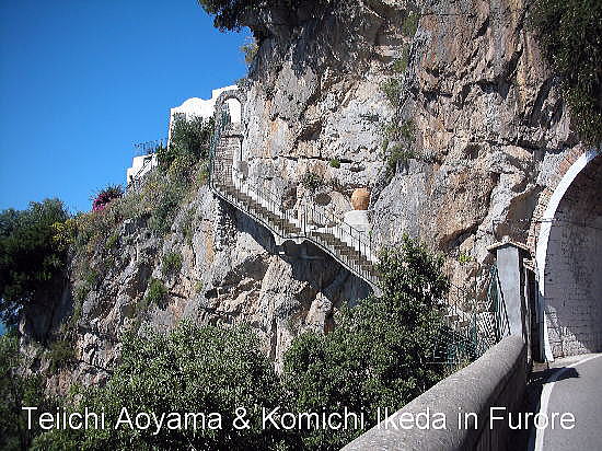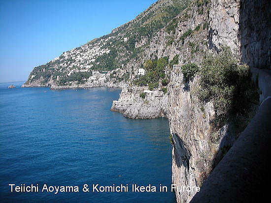 SS163号線は下の写真のようにアマルフィ海岸のシンボルロード、ここからはすばらしい景観が楽しめますが、結構、交通量も多く、本来、歩行は危険です。また車を運転しながらの見学は非常に危険なので、歩くのが一番です。