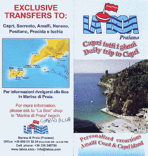 しかし、宿泊地と日程の関係からソレント港から定期航路船を使うより、フローレの小さな港から1日約6時間がかりの船旅コースがベストと考えました。しかも、フローレ、ポジターノ沖、カントーネ沖、ネラーノ沖、そしてカプリ島に行き、カプリ島で4時間自由行動した後、逆のコースでプライアに戻る船のツアーがなんと一人当たり55ユーロ(約7000円)と格安だったこともあり、プライア発のプレジャーボートのツアーを選択しました。