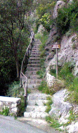 私たちはここから登り始めました。下は、登山口から石の階段を少し上ったところから見たプライア海岸です。きれいな海が見えます。