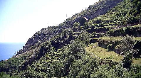 その後、プライアのSS163号線(ローマ通り)沿いにある登山入口から断崖絶壁を登山することになります。下は翌日、船から撮影したフローレのプライア海岸、登山した山々です。白い雲が立ち込めている辺まで上り、そのあと、右側(東側)に移動し、さらに左側を数km行くことになります。