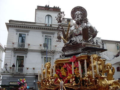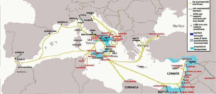 かくしてアマルフィは、イタリア最古の交易都市として11世紀をピークに、10世紀から12世紀までの200年間、ティレニア海における最大の交易都市となったのです。 アマルフィの人々は、航海に関する法典「アマルフィ海法」を作成しています。この法典はさまざまな海洋に関する法典の雛形となり、17世紀まで大きな影響力を持ちました。また、中国からイスラーム世界に伝わった製紙法がシチリア島経由でアマルフィにもたらされ、13世紀には製紙産業が勃興していたのです。 アマルフィの最盛期は11世紀に達成され、その後急速に衰退した。1131年にはノルマン人による征服、1135年、1137年はピサによる略奪、そして1343年での嵐によって都市の大部分が破壊された。 ●版図に見るアマルフィの交易範囲 下は1000年頃のイタリア半島。紫色のなかに黄色で示されている小さい国がアマルフィです。 ![]() 11世紀(1000年)のイタリア。アマルフィ公国が見える 出典:Wikipedia Italiano アマルフィ公国(Ducato di Amalfi)またはアマルフィ共和国(Repubblica di Amalfi)は、南イタリアのアマルフィを中心に9世紀から12世紀にかけて存在した海洋都市国家群を指します。当時、イタリアには北部にヴェネッチア、ヴェローナ、ピサなどが、中部にローマやカプアが、そして南部にアマルフィやされるもが、さらにシチリア島にはパレルモが都市国家として存在していたことになります。 アマルフィはピサ、ジェノバ、ヴェネツィアなど、北部の都市国家が台頭するまで、イタリアの商業の中心地として地中海貿易を支配していました。 ![]() アマルフィ共和国の守護神、セントアンドリュー 出典:Wikipedia Italiano ![]() アマルフィ公国の公国旗 カンパニアの旗 最盛期のアマルフィ公国の国際交易の範囲は先に述べたように、北は現在のイタリアのヴェニス、フランス、西はスペイン、南はモロッコからチュニジア、エジプト、東はコンスタンチノープル、トルコ、中近東諸国rまで広範囲に及んでいたことになります。 ![]() 最盛期のアマルフィの国際交易の範囲 出典:Wikipedia Italiano アマルフィは地中海貿易の先駆的存在であり、初めて海商法を整備した国であったことから、アマルフィの海商法は国家としてアマルフィが衰退した後も1570年頃まで使われ続けました。 つづく |