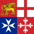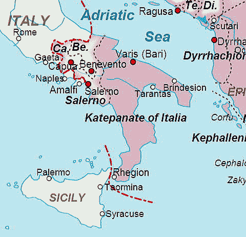しかし11世紀に入ると、政権は次第に不安定になりサレルノ公国からの介入を許すようになります。その後、1073年、ノルマン人のロベルト・イル・グイスカルドによってアマルフィが征服されると、アマルフィ公国の地位もグイスカルドの息子に奪われ、アマフィ公国は独立を失うこととなります。 1096年にアマルフィ内で反乱が起きますが、1101年に鎮圧されます。1130年に再度反乱が起きますが、逆に1131年、アマルフィ公国はルッジェーロ2世によってシチリア王国に併合されることになります。 とはいえアマルフィは11世紀半ば以降、地中海諸国で最初の海上法令を制定したことにより、ピサやジェノバなどとティレニア海における海上交易に係わる利益の確保について協約を結ぶことができ、収益性の高い貿易を享受することになります。 しかしながら、アマルフィは海上交易に関連しアマルフィ商人を保護する軍事力をもっていなかったことから、12世紀に入ってからピサやジェノバなどからの激しい攻撃を受けるようになります。 そのなかでピサの海軍はアマルフィとの海岸諸都市との協約を破棄し、アマルフィ諸都市を攻撃し、最終的にアマルフィは、その政治的独立性を喪失することになりました。 アマルフィは、ランゴバルト系のサレルノ公国の脅威にさらされるようになり、それを回避する目的で11世紀後半からノルマン人の保護と統治を受け入れるようになりますが、ピサからの攻撃による影響もあり、アマルフィは自立的な都市国家としての公国、共和国を維持することが困難となって行きます。 こうしてアマルフィはノルマン朝のシチリア王国に併合されることになり、1135年および1137年の2度に渡るピサからの攻撃を受けた後、都市国家としてのアマルフィ公国の威信や政治的独立性を急速に衰退させてゆきます。かくして200年に及び強大な繁栄を築いたアマルフィは、その経済力と海軍力を衰退化させて行ったのです。 下の地図は、11世紀から13世紀半ばの東ローマ帝国(ビザンツ帝国)時代の南イタリア地域を示しています。薄紫色の地域が東ローマ帝国の領土ないし影響下の土地を意味していますが、ナポリやアマルフィはその外側に位置していることが分かります。一方、サレルノは東ローマ帝国の領土内にあることも分かります。 ![]() 11世紀以降の東ローマ帝国(ビザンツ帝国)時代の南イタリア。 出典:Wikipedia 下の地図は1494年のイタリアです。 南イタリアにはナポリ王国とシチリア王国ができていることが分かります。 15世紀後半から19世紀までナポリ王国とシチリア王国が南イタリアを支配し、サレルノがナポリ王国とシチリア王国の両方の首都となっています。 下のイタリア地図はノルマン朝のシチリア王国にアマルフィが併合されたことを示しています。 ![]() 15世紀終わり(1494年)のイタリア。アマルフィはナポリ王国に包摂されていた 出典:Wikipedia Italiano 一方、以下の地図は、19世紀初頭のフランス帝国のナポレオン侵略後のイタリア(1812年)です。 濃い緑色の部分はフランス帝国の領土、図中央上部の緑色の部分はチザルピーナ共和国を1805年に改称し1814年まで継続したイタリア王国である。このイタリア王国は1861年成立のイタリア王国とは無関係です。 ナポリ王国(シアン色)の名も見えますが、支配者はナポレオンの兄ジョゼフ・ボナパルトを引き継いだナポレオンの義弟ジョアシャン・ミュラでした。彼は1815年まで在位しています。 ![]() 19世紀初頭のナポレオン侵略後のイタリア(1812年) 出典:Wikipedia Italiano ◆国旗にみるアマルフィの歴史 とはいえ、中世におけるアマルフィ公国やアマルフィ共和国は、海洋都市国家として強盛を誇り、海洋法の原型を作り上げることで現代のイタリア共和国の海事関係の一大基礎をつくりあげたことは間違いないところです。 現在のイタリア国旗には、アマルフィ同様、海洋国家として発展したヴェネツィア(ヴェネツィア共和国、左上の獅子)、ジェノヴァ(ジェノヴァ共和国、右上の十字)、ピサ(ピサ共和国、右下の十字)とともに、アマルフィの紋章(濃紺の八角十字)が取り入れられていることからもアマルフィが海上交易とその保護に果たした役割がよく分かる。 ![]() イタリア海軍旗 商船旗(市民用海上旗) アマルフィの紋章(濃紺の八角十字) 下はアマルフィの町中にあった絵図。 アマルフィの紋章(濃紺の八角十字)があります。 ![]() アマルフィの町中にあった絵図 アマルフィの紋章(濃紺の八角十字)があります 撮影:青山貞一 Nikon Coolpix S8 2013-5-8 また南イタリアの中世以降の歴史を見るとき、アマルフィはキリスト教勢力とサラセン(イスラム)勢力との確執、闘いの歴史の上できわめて重要な位置を占めていたことが分かります。 以下は、旗に見たアマルフィ公国とサラセン(イスラム)勢力と闘ったマルタ騎士団の歴史である。