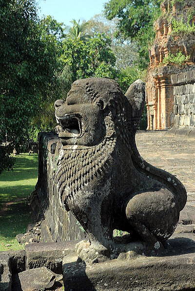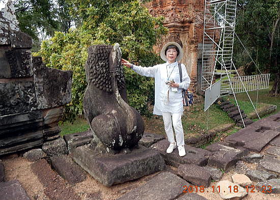 | アンコール遺跡全体目次 <南東部郊外の遺跡・寺院(ロリュオス)> プリア・コー1 プリア・コー2 バコン1 バコン2 バコン3 ロレイ1 ロレイ2 スピアン・プラプトス サンボー・プレイ・クック1 サンボー・プレイ・クック2 ◆バコン1(Bakong) 王都がアンコール地域に移る以前、ロリュオスに築かれた王都に「ロリュオス遺跡群」があります。 ロリュオス遺跡群内には最も大きな規模の「バコン」を中心に、王の両膝に捧げたとされアンコール遺跡最古の寺院「プリア・コー」、大貯水池インドラタターカの中央の「ロレイ」が建立されています。 私たちは、シェムリアップから半日とって、「バコン」、「プリア・コー」そして「ロレイ」のロリュオス遺跡群を参拝し、視察しました。 ![]() アンコール遺跡広域地図 ![]() ロリュオスのバコンなどの位置 ![]() 現地の3寺院位置図 ![]() バコン(Bakong)寺院全景 Source:Wikimedia Commons ![]() バコン(Bakong)寺院 出典:グーグルマップ バコン(Bakong)は、カンボジアにおける現代のシェムリアップに近いアンコールにおいて、クメール王朝の統治者によって構築された砂岩の山岳型寺院( temple mountain)です。 9世紀末の十数年間、今日、ロリュオスと呼ばれている地域に位置した古代の都ハリハラーラヤにおいて、王インドラヴァルマン1世(在位877-889年)の国家寺院としての役割を果たしました。 ![]() 撮影:青山貞一 Nikon Coolpix S9900 ![]() 撮影:青山貞一 Nikon Coolpix S9900 歴史 西暦802年、アンコール朝の初代の王ジャヤーヴァルマン2世が、カンボジアの主権を宣言しました。曲折の後、ジャヤーヴァルマン2世はハリハラーラヤにおいて彼の都城(首都)を制定しました。 数十年後、王の後継者は、アンコールにおける砂岩の最初の山岳型寺院として、バコン寺院を段階的に構築しました。石碑(分類 K.826)の碑文は、881年、王インドラヴァルマン1世がシヴァ神に寺院を捧げ、その中心に宗教的象徴であるリンガとして、その名前を王 (Indravarman) 自身と、シヴァ神 を表す接尾辞 "-esvara" の組み合わせであるインドレシュヴァラ神 (Sri Indresvara) を奉献したと述べています。 ジョルジュ・セデスによると、デヴァラージャ(神王)崇拝は、王権の正当性として神による王政という構想より成立したとしますが、後の著者は、それは必ずしも統治者自体の物理的な人物の崇拝を伴わないと述べています。 バコンは、わずか数年間、アンコールの国家寺院としての地位を享受しましたが、12世紀中頃ないし13世紀の後の造築は、それが放棄されなかったことを証明しています。 9世紀末にかけて、インドラヴァルマンの息子かつ後継者のヤショヴァルマン1世は、ハリハラーラヤから、現在アンコールとして知られるシェムリアップの北部地域に都城を移し、ここで彼はバケンと呼ばれる新しい山岳型寺院を中心に新都ヤショダラプラ(英語版)を建てました。 ![]() 中央のピラミッド型基壇を囲む煉瓦の塔は、ハリハラーラヤの他の寺院、プリア・コーやロレイに似ています。 Source:Wikimedia Commons ![]() 撮影:青山貞一 Nikon Coolpix S9900 構成 バコンの寺域は、東西900メートル、南北700メートルであり、2つの環濠と、東から西へ向かう主軸に区切られた3つの同心の周壁より構成されています。外周壁は、壁も塔門(ゴープラム)もなくなっており、その境界は今日、外側の濠が部分的に見られるのみです。 国道6号 (NH6) から現行の接続する道路は、第2周壁の端につながります。内濠が区域を画し、その内側の縁に、東西350メートル、南北320メートルのラテライトの周壁の跡と4つの十字形の塔門、それに広い土手道が交差して、その両脇にはナーガの欄干の原型のような7つの頭を持つナーガが並んでいます。2つの濠の間には、26基の付随する煉瓦の小祠堂の遺跡があります。 最も内側の周壁は、160メートル×120メートルのラテライトの壁で囲まれ、中央に寺院ピラミッドがあって、シヴァ神に捧げられた東向きの8基の煉瓦の塔の祠堂が、各面に2基ずつその周りにあります。 それら煉瓦の祠堂の扉口の枠や柱、偽扉は砂岩で造られ、まぐさ(リンテル)には精巧な浮彫りが見られます。また、ドヴァラパーラ(門衛神)やデヴァタ(女神)の塑像が側面にあります。その他いくつものより小さい構造物もまた周壁内に配置されている。東塔門のすぐ外側には、現代の仏教寺院があります。 ![]() 撮影:青山貞一 Nikon Coolpix S9900 ![]() 外を向いたシンハの像が、中央ピラミッドの石段にあり各基壇を守る。 Source:Wikimedia Commons このシンハの像はめずらしく尻尾が完全な形でのこっています。その他のシンハ像はほとんど尻尾が途中で壊れているものばかりでした。 ![]() 撮影:青山貞一 Nikon Coolpix S9900 ピラミッド型の基壇は5層からなり、その第1層の基壇は65メートル×67メートルです。その中央部は1936年から1943年に、フランスのモーリス・グレーズによって、アナスティローズの技法により再建されました。 頂上部にはかなり後に再建された塔が唯一1基あり、その様式はハリハラーラ