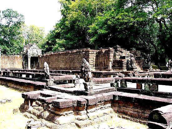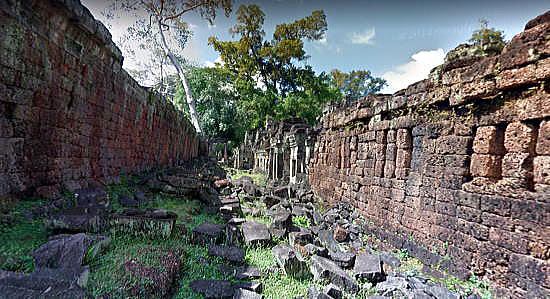 | アンコール遺跡全体目次 <北部の寺院・遺跡> プリヤ・カーン プリア・ピトゥ1 プリア・ピトゥ2 ◆プリヤ・カーン (Preah Khan) プリヤ・カーン (Preah Khan) は、カンボジアにあるアンコール遺跡の一つで、仏教とヒンドゥー教の習合寺院です。 名は「聖なる剣」を意味し、かつて境内で発見された剣に由来します。アンコール・トムの北東に位置します。 ![]() アンコール遺跡・寺院地図 下はプリヤ・カーン (Preah Khan) の位置を示しています。アンコール・トムの北東にあります。 ![]() プリヤ・カーン (Preah Khan) 寺院 出典:グーグルマップ 下の衛星写真は上の写真をズームアップしたものですが、プリヤ・カーンはもともと相当大きな規模の寺院であったことが分かります。 ![]() プリヤ・カーン (Preah Khan) 寺院 出典:グーグルマップ 下はプリヤ・カーン (Preah Khan)寺院ですが、以下の写真のようにすでにかなりの程度廃墟となっています。 ![]() 出典:グーグルマップ・ストリートビュー ![]() 出典:グーグルマップ・ストリートビュー 歴史 この地はかつてヤショヴァルマン2世の王宮が建てられており、寺院を建立したジャヤーヴァルマン7世は、王宮を支配していたチャンパ王国のジャヤ・インドラヴァルマン4世をここで戦って討ち、その跡に自らの父を模して彫らせた観世音菩薩像を1191年に安置しました。 かつて寺院には千人以上の僧侶が住み、それを支える荘園が与えられ、そこには97,840人が暮らしていたといいます。 ヒンドゥー教の神々や土地の聖霊らも境内に祀られていましたが、後にヒンドゥー教を信じるジャヤーヴァルマン8世により仏像は破壊されました。今はカンボジアの国教である仏教の僧侶らが境内で祈祷を行っています。 溶樹の繁殖や彫像の盗難による損壊が大きく、今も修復が行われていますが、カンボジアの安定に伴い多くの観光客が訪れています。 名の由来となった聖なる剣は、プノンペンの国立博物館に収められています。 伽藍 位置はアンコール・トムの北大門から1.5kmほど道を北東に進んだ右手に在ります。寺院はラテライトと砂岩で築かれており、境内は平面で環濠に囲まれ、東西800m南北700mの広さを持っています。 ![]() 壁面に彫られた観世音菩薩 Source:Wikimedia Commons ![]() 東からの参道 Source:Wikimedia Commons ![]() 中庭 Source:Wikimedia Commons 環濠を渡る橋は他の多くのアンコール遺跡と同じく、乳海攪拌の様子を彫った欄干で飾られており、大蛇とそれを引く神々と阿修羅が見られます。 本殿は三重の周壁に囲まれており、東西南北からの参道を持つが、南北の参道は崩壊し通行できません。かつて周壁はそれぞれ塔門を備えていたといいますが、これも崩れ落ちています。周壁の門は本殿に近づく程に間口と高さを狭め、遠近法により寺院を広く見せています。 参拝は東の参道から行われており、その途路では壁面に刻まれた仏の観世音菩薩やヒンドゥー教のリンガが見られます。参道を抜け中庭に出ると、大蛇の欄干で縁取られたテラスが在ります。また中庭の南側にはアンコール遺跡において珍しい、円柱を持つ二階建ての経蔵が残っています ![]() 円形の経蔵 Source:Wikimedia Commons プリア・ピトゥ1につづく アンコール遺跡全体目次 |