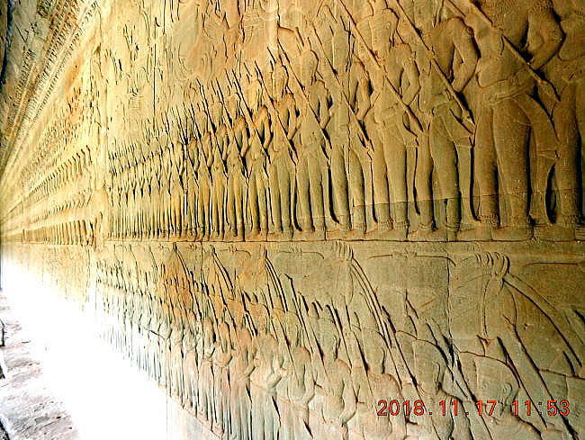 | アンコール遺跡全体目次 <アンコール・ワット> はじめに 東門 第1回廊 第2回廊 第3回廊、中央祠堂 十字回廊 千神経蔵 前庭 経蔵・西門 概要 歴史 修復活動 ◆第1回廊 ![]() 下の写真は東門から入りまっすく西側に進んでいったところにあるアンコール・ワットの第1回廊です。ここには壁に素晴らしい彫刻があります。 以下は第1回廊に向かう途中の写真です。 ![]() 撮影:随行学芸員 Nikon Coolpix S9900 以下は第1回廊に上る階段です。 ![]() 撮影:青山貞一 Nikon Coolpix S9900 2018-11-17 以下は外から見た第1回廊です。 ![]() 撮影:青山貞一 Nikon Coolpix S9900 2018-11-17 ![]() 撮影:池田こみち iPhone 下は、第1回廊の西面です。 ![]() 第1回廊西面 撮影:青山貞一 Nikon Coolpix S9900 2018-11-17 下は第1回廊の壁面です。この壁面には素晴らしい彫刻が施されています。 ![]() 撮影:池田こみち Nikon Coolpix S9900 2018-11-17 ![]() 撮影:随行学芸員 Nikon Coolpix S9900 ![]() 撮影:池田こみち Nikon Coolpix S9900 2018-11-17 第1回廊の西面に有名な彫刻があります。 ![]() 第1回廊西面の彫刻 Source: Wikimedia Commons パブリック・ドメイン, リンク 下は、第1回廊西面の彫刻を撮影したオリジナルと、デジタル処理後の彫刻です。 ![]() 第1回廊西面の彫刻 撮影:池田こみち Nikon Coolpix S9900 2018-11-17 ![]() 第1回廊西面の彫刻 撮影:池田こみち Nikon Coolpix S9900 2018-11-17 デジタル処理:青山貞一 ![]() 第1回廊西面の彫刻 撮影:青山貞一 Nikon Coolpix S9900 2018-11-17 ![]() 第1回廊西面の彫刻 撮影:青山貞一 Nikon Coolpix S9900 2018-11-17 ![]() 第1回廊西面の彫刻 撮影:青山貞一 Nikon Coolpix S9900 2018-11-17 ![]() 第1回廊柱の彫刻 撮影:池田こみち Nikon Coolpix S9900 2018-11-17 第一回廊では、柱に彫られたこまかい唐草模様とデヴァタの姿を見ることができます。また連子窓から漏れる光が非常に美しく、往時の雰囲気を醸し出しています。 注)連子窓とは(Wikiより) 連子窓(れんじまど)は、断面方形又は菱形の細長い木材(連子子)を縦又は横に連ねた連子を嵌め込んだ窓です。 採光、通風、防犯を目的としています。 寺院や神社で用いられることが多く、日本では法隆寺、薬師寺、春日大社、大極殿の回廊等に見られます。 ![]() 第1回廊の彫刻 撮影:青山貞一 Nikon Coolpix S9900 2018-11-17 ![]() 第1回廊の彫刻 撮影:青山貞一 Nikon Coolpix S9900 2018-11-17 ![]() 第1回廊の彫刻 撮影:青山貞一 Nikon Coolpix S9900 2018-11-17 <解説>第一回廊の壁面レリーフについて 参考 以下の資料を参考に第一回廊の壁面に彫られたレリーフについて説明を加えます。順番が私たちが実際に入った東側から北、西となっています。 h 第一回廊の壁面は多岐にわたっています。私たちが入った東側の面には、まず、乳海攪拌の詳細なレリーフが描かれています。途中、美しいデヴァタのレリーフを見ながら北に進むと、今度はヒンドゥー教の神であるヴィシュヌ神と阿修羅の戦いの図へと変わります。 角を曲がって北側の回廊に入ると、クリシュナーとバーナの戦いの図などが続き、白鳥に乗るブラフマーの先で西回廊に入る、西回廊北側には、ラーマーヤナの物語、西回廊南側には、マハーバーラタの物語が彫られています。 南回廊はゆっくり見る時間がなかったがアンコール・ワットを創建したスーリヤヴァルマン2世の軍隊や天国と地獄の様子を描いたレリーフで埋め尽くされているといいます。 第2回廊につづく アンコール遺跡全体目次 |
