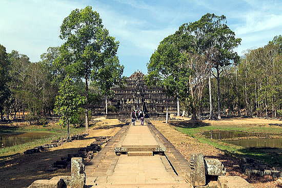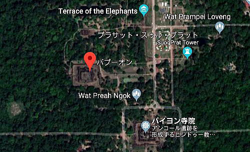 | アンコール遺跡全体目次 <アンコール・トム> アンコール・トム 南北門 東西門 王宮 ピミアナカス バイヨン1 バイヨン2 バイヨン3 バイヨン4 象のテラス1 象のテラス2 象のテラス3 ライ王のテラス1 ライ王のテラス2 ライ王のテラス3 プラサット・スゥル・プラット クリアン1 クリアン2 バプーオン1 バプーオン2 ◆バプーオン1(Baphuon) バプーオン(Baphuon)は、カンボジアのアンコール遺跡にある寺院の1つであり、アンコール・トムにあるバイヨンの北西に位置しています。 11世紀中頃の1060年頃、ヒンドゥー教の神シヴァに捧げられ、ウダヤーディチャヴァルマン2世(在位1050-1066年)の国家的寺院として築かれました。3層からなる山岳型(ピラミッド型)寺院で、バプーオン様式の原型です。 ![]() アンコール遺跡・寺院地図 ![]() アンコールトムとバーブオンの位置 以下は、グーグル衛星写真でみたバーブオンです。 ![]() バプーオンの位置 出典:グーグルマップ ![]() バプーオンの位置 出典:グーグルマップ ![]() バプーオンの位置 出典:グーグルマップ 以下はバプーオンの外観写真です。 ![]() Baphuon. Angkor Thom, Siem Reap Province, Cambodia. Source:Wikimedia Commons ![]() ウダヤディチャヴァルマン(Uaphadityavarman)2世の治世中に砂岩で建てられた11世紀の半ばに遡る3階建てのバプーオン・シヴァイテ寺院の山の東側ファサード。16世紀には、寺院は西側ファサードの上に大きな仏層を建てるための採石場として機能しました。 EFEOは1960年にこの寺院の修復を開始し、2011年に完成しました。戦争により1970年から1992年の間は中断していました。崩壊、植生の侵入、クメール・ルージュによる建築敷地の遺跡の破壊、地下室の不安定性、壁の変形、水の浸入、時間の経過による改造、地下室の補強など、困難なことは無数にありました。目に見えないように後背部に鉄筋コンクリートの支柱で支えて補強しました。この目的を達成するために、すべてのファサードをいったん別の場所に除けて作業しました。(意訳) Source:Wikimedia Commons 以下はバプーオンの遠景写真です。 ![]() バプーオン、アンコール・トム、シェムリアップ州、カンボジア Source:Wikimedia Commons ◆バプーオンの構成 バーブオン寺院は、王宮の周壁の南側に隣接し、東西425メートル、南北125メートルにおよぶ砂岩の周壁に囲まれています。王宮前広場の南端にあるその東塔門から長さ200メートル、橋脚の高さ約1メートルの参道が内側の塔門に向かって延びています。 途中に十字形のテラスがあるこの参道は、3列に並ぶ円柱の橋脚とともに、ほとんど崩壊していましたが、フランス極東学院 (EFEO) によって修復されました。 須弥山(メル山)を象徴する山岳型寺院であり、その基盤は東西120メートル、南北100メートルにおよびます。3層の基壇の上は回廊で囲まれ、中央祠堂が1基あります。高さは34メートルでありますが、およそ50メートルの高さに至る塔があったとされます。 ![]() バプーオン寺院平面図 Source:Wikimedia Commons その特徴のある外観は、13世紀末、元の皇帝・成宗の使節であった周達觀が1296年から1297年にかけて訪問した際の『真臘風土記』に記され、「銅塔一座(バプーオン)があり、金塔(バイヨン、高さ45メートル)に比べて更に高い」とあります。また、この「銅塔」から、もとは銅葺きであったとも考えられます。 15世紀後期、バプーオンは仏教寺院に改められ、長さ70メートル、高さ9メートルの涅槃仏像が西側の第2層に建造されましたが、おそらくそれには以前8メートル以上におよんだ塔を取り壊す必要があったことが、現在その塔がない理由とされています。 バプーオン寺院は砂に覆われた敷地に建造され、またその巨大な規模によって、その立地は寺院の歴史を通して不安定でした。大部分はおそらく寝釈迦像が付け加えられた頃にはすでに崩壊していました。 ◆バプーオンの修復 ![]() 修復された円柱の橋脚と参道 Source:Wikimedia Commons 20世紀には、寺院の大部分がほとんど崩壊しており、また、1920年代の修復の取り組みはその後問題をみせました。1960年にフランスの考古学者ベルナール=フィリップ・グロリエのもとで始まった取り組みは、クメール・ルージュが勢力を得ることにより1972年に中断され、石材の位置についての記録は失われました。 1994年2月、再びフランス極東学院 (EFEO) の考古学者チームにより修復が開始されました。修復の継続中は訪問者の入場を制限していましたが、 2010年11月になって、部分的な訪問者の入場が、中央の建造物を除いて再び許可されました。 2011年4月、1960年より51年を経て、考古学者らは寺院の修復を終えました。カンボジアの国王ノロドム・シハモニとフランスの首相であったフランソワ・フィヨンはともに、2011年7月3日の公開式典において復元された寺院を最初に見学しました。 一般公開も開始されましたが、観光客が転落したことより、安全面に関する検証のため一時閉鎖され、その後同年11月14日に一般訪問者の入場が再開されるようになりました。 バ