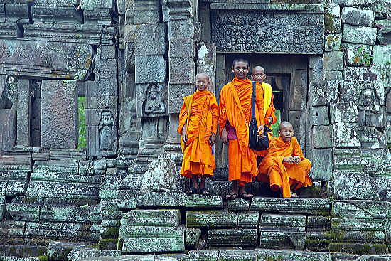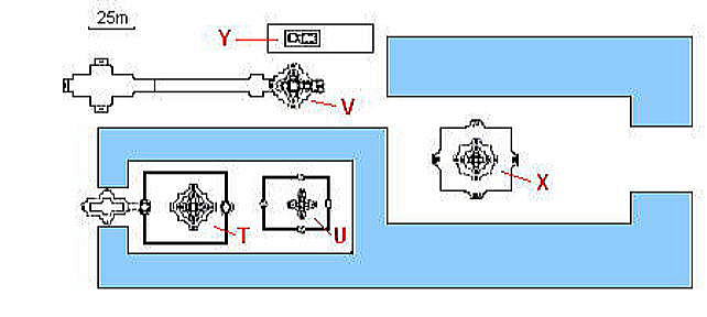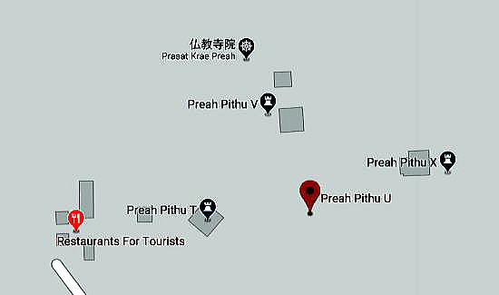 | アンコール遺跡全体目次 <北部の寺院・遺跡> プリヤ・カーン プリア・ピトゥ1 プリア・ピトゥ2 ◆プリア・ピトゥ1(Prah Pithu) プリア・ピトゥ(Prah Pithu)は、カンボジアのアンコール遺跡における5つの寺院からなる寺院遺跡群です。 ![]() アンコール遺跡・寺院地図 プリア・ピトゥ(Prah Pithu)は、アンコール・トムのすぐ北に位置しています。 ![]() 出典:グーグルマップ プリア・ピトゥは下図のように、プリア・ピトゥT、プリア・ピトゥU、プリア・ピトゥV、プリア・ピトゥXと4つの離れた寺院から構成されています。 ![]() 出典:グーグルマップ ![]() glimpse of Temple "T" - Preah Pithu group Source:Wikimedia Commons 遺跡 プリア・ピトゥ(Prah Pithu)の寺院群は、アンコール・トムにあるバイヨンの北、テップ・プラナム (Tep Pranam) の前方(東)に位置します。 その寺院群は近接していますが、それらは2つを除いて、同時代に建造されたものではなく、12世紀前半-13世紀頃(13-14世紀)、スーリヤヴァルマン2世(在位1113-1150年)からジャヤーヴァルマン8世(在位1243-1295年)の時代にかけて構築された寺院群とされています。しかし年代の特定には至っておらず、その順列は明らかではありません。 それらの寺院は T、U、X、V、Y のアルファベットで分類されています。「X」は仏教寺院であり、それは未完成のままでおそらく最も後期のものです。その他はヒンドゥー教寺院です。 5つの寺院は状態が悪く、上層部は崩壊していますが、それらの彫刻は興味深いものであり、またその場所は静寂に包まれ、樹木が茂ってほとんど人はいません。大抵は涸れている濠が、寺院群の一部を取り囲んでいます。それらはまず1908年に Jean Commaille により、その後1918年から1920年にアンリ・マーシャルによって整備されました。 ![]() プリア・ピトゥ寺院群の構成 Source:Wikimedia Commons 寺院「T」・「U」 ![]() 寺院Tと少年僧 Source:Wikimedia Commons これらの寺院はまず間違いなく同時に建造されたもので、同じ東西軸上にあり、単一の濠によって囲まれています。 それらは西を向いており、入口にはナーガの欄干と2つの基壇に十字型のテラスがある。寺院「T」は、東西45メートル、南北40メートルの砂岩の周壁を持ち、東西の主軸上に2つの塔門(ゴープラム〈ゴープラ〉)があります。 聖所は、高さ約6メートルの[5]装飾された3層の基壇上にあり、その台座の上にある大きなリンガを保護した祠堂を持っています。地上にある西側の扉のまぐさ(リンテル)の断片には、「乳海攪拌」を様式化した描写が見られ、壁はデヴァターや花の模様が、バイヨン様式で装飾されています。 寺院「U」は「T」に似るが、より小さくて[5]簡素です。その周壁は東西35メートル、南北28メートルで塔門はありません。2層の基壇上に祠堂があり、西の扉のまぐさは、ヴィシュヌとブラフマーの間に、カーラ(kala、キールティムカ)の頭で踊るシヴァのいる三神一体を示しています。 内壁にはドヴァラパーラが彫られており、柱の基部の盲アーチはアンコール・ワットの時代に特有なものです。 北側のまぐさには「乳海攪拌」のもう一つの描写があります。 寺院「X」 ![]() 寺院 X 聖室内にある2列の仏陀像 Source:Wikimedia Commons 寺院「X」は、寺院「U」の約100メートル東にあり、一辺40メートル、高さ4メートルの大きな基壇上に建っています。濠が涸れている場合は真っ直ぐに到達可能です。 その様式は前述の寺院と同様であるが、より大きくかつその装飾は不完全です。「X」は仏教寺院であり、聖室の壁には、彫刻された二列の仏陀像があります。さらにまぐさは仏教のモチーフを示しています。 しかしながら最も関心を引く遺構である有名な釈迦の断髪を描くものはそこにはありません。東に向かうラテライトのテラスは結界石(シーマ石、sema 〈仏の形象描写の刻まれた境界石〉)によって囲まれ、聖域の境界を定めていまあす。 寺院「V」 ![]() 寺院V Source:Wikimedia Commons 寺院 Vは残存する濠の外側、寺院「U」の北に、寺院「V」はあります。それは東に向いており、二重の前庭より始まり、周壁はありません。西には渡り参道があり、それは長さ40メートルの十字型テラスに終わって、王宮広場の北東の角に通じています。 その聖室は、2層の彫刻された基壇上に建ち、寺院群のうち最も大きく3.8メートル四方で、大きな1.5メートルのリンガを祀っています。そのアンコール・ワット様式の外部の装飾は未完成です。 寺院「Y」 ![]() 寺院 Y 南側の半フロントン Source:Wikimedia Commons 寺院「Y」は、基壇や階段を持たず、「V」の北側の、土でできた台地の上に建っています。それはアンコール・ワットの時代からバイヨンの時代の間のものです。 東に向かって、入口としての長い拝殿(マンダパ、mandapa) があり、前庭によって高さ0.95メートルのリンガを祀った3.5×3.0メートルの聖室につながっています。 より大きな部屋はほとんど崩壊していますが、その西側には2つの注目すべき半フロントン(fronton、ペディメント〈破風〉)があり、北にクリシ