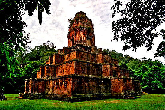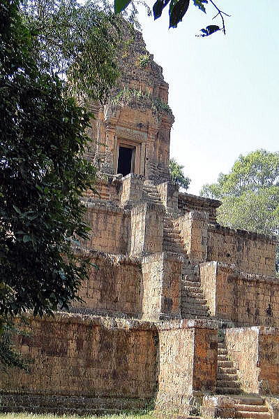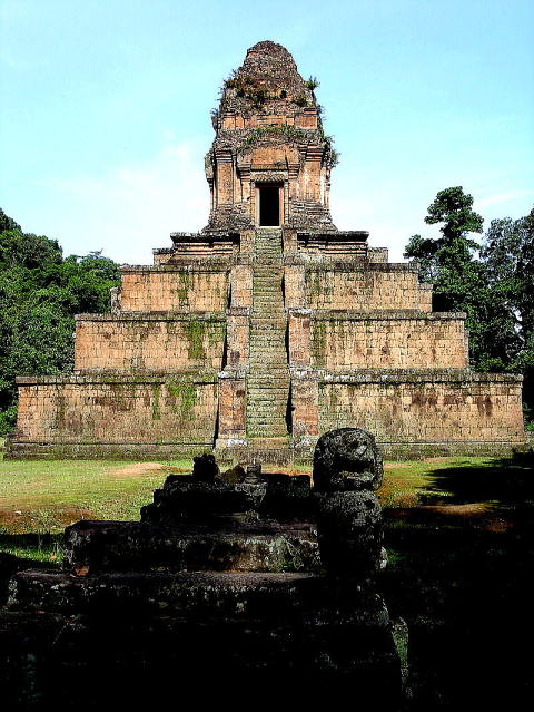 | アンコール遺跡全体目次 <中心部周辺の寺院・遺跡> プノン・バケン タ・プローム・ケル プラサット・バイ バクセイ・チャムクロン トマノン1 トマノン2 チャウ・サイ・テヴォーダ ◆バクセイ・チャムクロン(Baksei Chamkrong) バクセイ・チャムクロン(Baksei Chamkrong)は、カンボジアのシェムリアップに近いアンコール遺跡群の小さなヒンドゥー教寺院 (Hindu temple) です。寺院はシヴァ神に捧げられ、シヴァの金色の像を保持していました。バクセイ・チャムクロンは南大門からアンコール・トムに入るとき左側に見られます。 バクセイ・チャムクロンは10世紀、息子である王ハルシャヴァルマン1世(在位910-944年)により、父ヤショヴァルマン1世に捧げられました。寺院はラージェンドラヴァルマン2世(在位944-968年)によって完成しました。 ![]() アンコール遺跡・寺院地図 以下のグーグルマップは、バクセイ・チャムクロン(Baksei Chamkrong)の位置を示しています。位置はアンコール・トムの南大門のすぐ南にあります。 ![]() 出典:グーグルマップ ![]() 出典:グーグルマップ 以下バクセイ・チャムクロン(Baksei Chamkrong)の祠堂の写真です。 ![]() バクセイ・チャムクロン(Baksei Chamkrong) Source:Wikimedia Commons 名前 バクセイ・チャムクロンという名は、「翼下で護る鳥」を意味し、王が攻囲されたアンコールから逃れようとしていた時、巨大な鳥が舞い降りて、その翼の下で王を護ったという伝説に由来しています。 構成 ![]() 東側より Source:Wikimedia Commons この寺院は、煉瓦やラテライトなどの耐久性のある素材と砂岩の装飾により建築された最初の寺院の1つです。当初は煉瓦の周壁がピラミッド型寺院を囲んでいましたが、東側の塔門(ゴープラ、gopura)もわずかに残る痕跡以外ほとんど完全に消滅しています。 ![]() バクセイ・チャムクロンの位置 Source:Wikimedia Commons ピラミッド型寺院の4段のラテライトの基壇は直径27メートル、頂上部では15メートル、高さは12メートル。 4本の階段が基壇の頂上部まで伸びます。煉瓦の中央祠堂が8メートル四方の砂岩の基盤に建ちます。東の扉が開き、ほかの3面には通常の偽扉があります。 ![]() 平面図 Source:Wikimedia Commons ![]() 偽扉 Source:Wikimedia Commons 寺院の外面の化粧漆喰(スタッコ)は大半が失われています。中心の砂岩のまぐさ(リンテル)は、インドラが3つの頭の象アイラーヴァタの上に立っている細かな彫刻で装飾されています。 花輪模様がインドラの両側から、遺跡に一般的な様式で広がっています。碑文が小さい扉口の両側にあり、ジャヤーヴァルマン2世からのクメール王朝初期の王たちや、同じく国家の祖先である隠者カンブー (Kambu) など、より以前の伝説的な王たちへの奉献と賛美が記されています。 ![]() まぐさ(リンテル)の装飾。アイラーヴァタの上にインドラが、両端にはガネーシャが彫られる。 Source:Wikimedia Commons 以下はバクセイ・チャムクロン寺院の写真ギャラリーです。 ![]() Angkor temples, north of Siam Reap, Cambodia Source:Wikimedia Commons ![]() Baksei Chamkrong. Angkor Cambodia Source:Wikimedia Commons ![]() Temple entrance Source:Wikimedia Commons トマノン1につづく アンコール遺跡全体目次 |