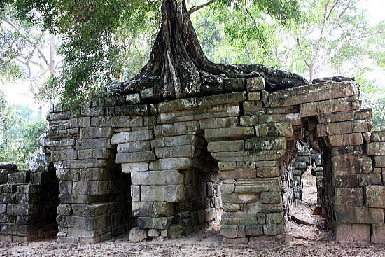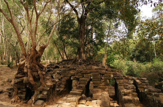 | アンコール遺跡全体目次 <東部の寺院・遺跡1> スピアン・トマ タ・ケウ1 タ・ケウ2 バンテアイ・サムレ1 バンテアイ・サムレ2 タ・プローム1 タ・プローム2 スラ・スラン バンテアイ・クデイ1 バンテアイ・クデイ2 バンテアイ・クデイ3 ◆スピアン・トマ(Spean Thma) スピアン・トマ(Spean Thma)は、カンボジアのアンコール地域にある「石の橋」(スピアンは「橋」で、トマは「石」の意)として知られています。 現在に残るいくつかのクメール王朝時代の橋のひとつであり、タ・ケウの西に位置します。 ![]() アンコール遺跡・寺院地図 スピアン・トマ(Spean Thma)は、トマノンの南東、タ・ケウの北西のシェムリアプ川にかかる橋です。 ![]() 出典:グーグルマップ ![]() スピアン・トマ−シェムリアップにあるアンコール時代以降の橋−カンボジア Source:Wikimedia Commons アンコール・トムと東バライの間にあるシェムリアップ川の手前の小道に造られ、多くの再利用された砂岩のブロックを含んでいることから、おそらくはクメール時代(15世紀頃)の後、16世紀中頃に再建されたものではないかと推察されています。 現在に残る14の狭いアーチ(迫り出し構造の隙間)は、幅1.6メートル。樹の根が張った橋の中央部分が崩壊せずに残存します。 同じ構造の橋は、他にもアンコール地域のスピアン・メーマイ (Spean Memai) や、前王国のいくつかの場所で見られます。アンコールから南東に向かう道にあるスピアン・プラプトス (Spean Praptos) は、 25のアーチをもつ最も長い石橋の1つです。 ![]() スピアン・トマ−シェムリアップにあるアンコール時代以降の橋−カンボジア Source:Wikimedia Commons ![]() 出典:グーグルマップ・ストリートビュー ![]() 出典:Malte Scholz、グーグルマップ・ストリートビュー ![]() これは、その昔はシェムリアップ川にかかる橋で、象がアンコールで寺院を 建造するための石材を運んで通った。カンボジア、シェムリアップ、2006年12月 Source:Wikimedia Commons タ・ケウ1につづく アンコール遺跡全体目次 |