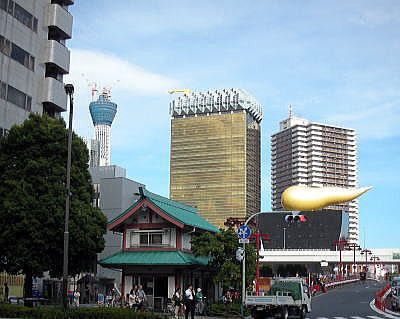 2010年7月14日の午後、ひさびさ浅草にでかけた。 浅草寺の近くにある公立高校から模擬授業を依頼され、地球環境問題について模擬授業を高校生に1時間半ほど行った。生徒はしっかりと私の話を聞いてくれた! 模擬授業を終えた後、浅草寺(せんそうじ)をひさびさに訪問した。 その途中、隣の墨田区で建設中の東京スカイツリーという電波塔が良く見えた(下の写真)。7月14日は前日までの雨天から一転し、真夏の日差しが照り返す好天となったこともあって、スカイツリーの全貌が良く見れた。 撮影:青山貞一、Nikon Cool Pix S10 2010.7.14 この東京スカイツリー(Tokyo Sky Tree)は、東武鉄道と東武タワースカイツリーによって東京都墨田区の押上に建設されている電波塔である。 東京スカイツリーの位置(地図中左に浅草寺が見える) 出典:マピオン 着工当初は高さを610.6mとする計画であったが、2009年10月16日に高さが634.0mとなるように計画を変更したた。完成すれば自立式電波塔としては世界一の高さとなるという。 Wikipediaによれば、スカイツリーは下図のごとくなので、全体が634mのうち、現在は360〜370mまで完成していることになる。 出典:Wikipedia スカイツリーは2008年7月14日に着工、2011年12月から遅くとも2012年早春に竣工の予定という。これはいわゆる地デジ移行に合わせたものだろうが、BS、CSなどインド洋上の静止衛星を使えば、日本中くまなくテレビ電波が送れる時代、はたして600mを超す電波塔がどれだけ必要とされるのか疑問がある。 というのも、いくら電波塔を高くしたとしても、今の東京はじめ首都圏では100mを超す超高層ビルがこれでもか、これでもかと建築されている。となればアナログよりましとはいえ、ビル影の難視聴地域があちこちにでき、綺麗に見るためには、それぞれ同軸や光ケーブルを使った共同視聴システムに頼らざるを得ないからだ。 もっぱら、衛星ではよほどチャンネルを多く取らない限り、地方固有の番組を流すわけにはゆかないから、VHFやUHFを使って一定地域を対象としたテレビ送信が必要となるのだろう。 とはいえ、テレビの内容が今のように、際限なく劣化し、エロ・グロ・ナンセンスとなり、同時に大メディアがこぞって情報操作による世論誘導を行っている以上、いくらデジタルハイビジョンによる地デジ放送を行ったとしても、視聴者が増えるとも思えない。 あるブログにも私の考えに近くものがあった! ....現状の民放の放送内容の酷さはどうだ。馬鹿なお笑いタレント(少しも笑えない奴らばかりだが)が騒ぎまくるばかりのクズ放送ばかりで、そんな程度のものを鮮明映像で見る必要性もない。現状のアナログ放送で十分すぎる。それに、デジタルならBSとCSがあり、それらのほうが難視聴地域解消にも役立ち、地上デジタルなんかとは月とスッポンほど有用だ。なのに、民放のBSデジタル放送はテレビ通販のクソ番組ばかり。そのBSデジタルを有効利用するのが地上デジタル導入なんかより重要だろうが。 やはり地デジなどのデジタル化、ハイビジョン化は、総務省(旧郵政省)と放送業界それに家電業界がつるんだ電波を使った既得権益、利権の拡大策と思われても仕方ないだろう。 いくら技術的に見て仔細で素晴らしい画像が受像できても、今のようなバカバカしい番組、それにどこをまわしても同じようなニュースや情報番組ばかりでは、どうにもならない。 また世は双方向コミュニケーションが可能なインターネット時代である。一方的にバカバカしい、エロ・グロ・ナンセンス情報とCMを送ってくるテレビメディアは、ごく一部以外、今後、見識、知性ある人間は見ないだろう! 下は、雷門通りの吾妻橋側付近からみたスカイツリーである。 撮影:青山貞一、Nikon Cool Pix S10 2010.7.14 下はさらに雷門通りを浅草寺側に行ったところから撮影した写真である、 撮影:青山貞一、Nikon Cool Pix S10 2010.7.14