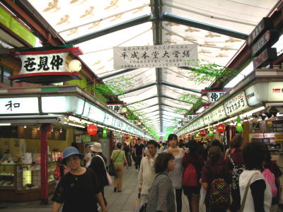 下が仲見世通りである。お土産屋、雑貨屋、食べ物屋などの小さなお店が通りの両側に所狭しと並んでいる。浅草といえば、このアーケード構造の仲見世通りがひとつのシンボルである。「雷おこし」の店だけでも数10軒あるのではないか。