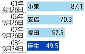 安倍、福田の2代に渡る世襲による1年放り投げ内閣の後、選挙管理内閣として麻生内閣が誕生した。しかし、この麻生内閣は、自身が典型的な親の七光りの世襲議員であるだけでなく、閣僚も18人のうち13人が世襲議員と、もとより政治家としての資質、正当性が疑われる人間ばかりだ。 ◆青山貞一:麻生内閣の閣僚、18人中13人(72%)が世襲! この9月24日から25日、マスコミによる全国世論調査(電話)が行われたが、麻生内閣の支持率は、ご祝儀相場のポイントもなく、あの安倍、福田内閣よりも低いありさま。 毎日新聞 45.0% 朝日新聞 48.0% 共同通信 48.6% 読売新聞 49.5% フジサンケイネットワーク 44.6% 日本テレビ系 46.7% テレビ朝日系 50.4% 日経新聞 53% これらはいずれも福田内閣発足時(2007年9月)の支持率を5ポイントから12ポイントも下回っている。 これを小泉首相以降の歴代総理と比較すると以下のようになる。ただし、過去の支持率を含めデータは読売新聞。 ![]() 出典:読売新聞 歴然と、麻生内閣は出発当初から国民の支持がないことが分かる。 当人や官房長官は、強がりを言っているが、国民の多くは、「世襲のおぼっちゃま」首相と内閣が4代つづいていることにうんざりしている。北朝鮮をまったく嗤えない常態にある。