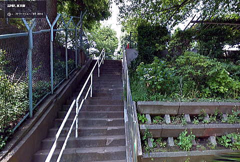◆御殿山(ごてんやま) 城南5山の最初は御殿山です。 御殿山は「目黒川とサクラ」で最後に行った大崎新副都心のすぐ北側からJR山手線の海側の北品川一帯、現在の地番では品川区北品川3丁目、4丁目と5丁目に相当します。 なお、御殿山地区へはJR品川駅、JR大崎駅以外に京急の北品川駅が最も近い駅となっています。 ![]() 東京都における御殿山の位置 出典:グーグルマップ ◆江戸時代の御殿山の位置 下は歌川広重(初代)の東都名所 御殿山花見 品川全図の一部です。多くの絵から構成されており、見づらいのですが、江戸時代の御殿山と北品川宿の位置関係が明確に示されている貴重な資料と言えます。 下図では右側にサクラ花見の御殿山が描かれ、中央に東海道の北品川宿が見えます。さらに上側には沢山の船が停泊する東京湾が描かれています。 ![]() 東都名所 御殿山花見 品川全図の一部 歌川広重(初代) 出典:江戸時代の道、第11回、品川区 以下は、楊斎延一、東京名所「御殿山より品川を望む」、明治32年(1899)です。出典は品川区インターネット美術館です。 この東京名所「御殿山より品川を望む」(明治32年)と上の東都名所「御殿山花見」の絵(江戸時代)はほぼ似た位置、すなわち御殿山から東京湾を望んだものと推察できます。 ![]() 楊斎延一、東京名所「御殿山より品川を望む」、明治32年(1899) 出典:品川区インターネット美術館 ◆江戸時代の御殿山の現在の位置 上の貴重な2つの絵から推察すると、JR山手線の海側にあたる北品川3丁目は江戸時代は御殿山の主要部分を構成していましたが、明治維新以降、とくにJR山手線やその後の京急電鉄の開通により御殿山を地形改変することで山(丘)は大幅に削られています。 すなわち以下の地図で北品川3丁目と4丁目、5丁目は丘陵、高台として一体のものでしたが、明治以降のJRや京急などの鉄道の軌道を立地する際に、3丁目と4丁目の間の丘陵が削られ、現在の谷とに地形が改変されています。 ![]() 江戸時代の御殿山相当地区 出典:グーグルマップ その結果、現在における「御殿山」は、ミャンマー大使館、セルビア大使館、モーリタニア大使館などの大使館や原美術館など閑静な住宅地、さらに森ビルが開発した御殿山ヒルズ(現在はトラストタワーという高級マンションとマリオットホテル、品川教会、御殿山庭園)などとして再開発されている北品川4丁目さらに「ソニー村」と言われた北品川5丁目地域、さらに上述のJR山手線の海側に当たる北品川3丁目の「権現山公園」あたりが相当するものと推察されます。 ![]() 江戸時代と現在の「御殿山」の地形断面の変化 ただし、縦軸はディフォルメしていいます。 出典:青山貞一 下の衛星写真は現在の御殿山周辺を示しています。鉄道の軌道が東西に御殿山を分断していることがよく分かります。<北品川3>の北に相当する部分に「権現山公園」があります。権現は言うまでも無く徳川家康を示します。江戸時代、この辺は「品川御殿」ともよばれていました。 ![]() 江戸時代の御殿山相当地区 出典:グーグルアース 下の写真は「権現山公園」に行くための階段です。当然のことながら、この権現山公園は桜の名所となっています。 ![]() 北品川3丁目の権現山公園に行くための階段 出典:グーグルストリートビュー ![]() 出典:サクラハウジング