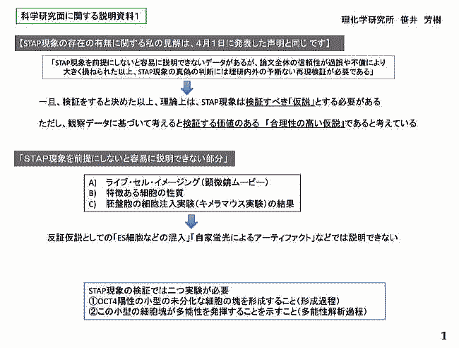以下に、STAP現象、細胞などの研究に関連する関係者の記者会見、質疑、主な報道、ブログのうち、公開されているYouTube動画、PDF、htmlを時系列的に掲載します。今後、関連情報を追加する予定です。 <参照文献・動画一覧> 2014/1/30 STAP細胞発見 NHKニュース 放映 https://www.youtube.com/watch?v=KyR3DJHlufI 2014/4/1 小保方晴子STAP細胞最終報告 理研会見 2014/1/30 https://www.youtube.com/watch?v=RXTorTMpAqQ ※小保方晴子経歴・研究実績等 2014/4/9 小保方晴子氏記者会見 https://www.youtube.com/watch?v=Nbr6WrhJCW4 2014/4/7 (全録)「STAP細胞」検証計画について理化学研究所が会見(1/3) https://www.youtube.com/watch?v=hYLzHG87yU4 2014/4/7 (全録)「STAP細胞」検証計画について理化学研究所が会見(2/3) https://www.youtube.com/watch?v=kJyXSJ03-og 2014/4/7 (全録)「STAP細胞」検証計画について理化学研究所が会見(3/3) https://www.youtube.com/watch?v=83LKlS8h8vI 2014/4/9 理研、丹羽仁史 「検証実験」に関する会見動画(質疑) https://www.youtube.com/watch?v=Q-0YjeeJyNc ※丹羽仁史経歴・研究実績等 2014/4/9 理研、丹羽仁史 「検証実験」に関する会見動画(検証実験計画) https://www.youtube.com/watch?v=TZk_gzVW4YI 2014/4/16 笹井芳樹氏(理化学研究所) 記者会見動画 https://www.youtube.com/watch?v=56E6gfI6aQE ※笹井芳樹経歴・研究実績等 2014/4/16 笹井芳樹氏(理化学研究所) 記者会見資料 配布資料(以下参照) http://www3.riken.jp/stap/j/s3document1.pdf ![]() ![]() ![]() 2014/6/12 理研改革委 小保方STAP再現実験への参加提言 https://www.youtube.com/watch?v=Gy78qUc8gWU 2014/6/12 【STAP細胞】 改革委員会による記者会見 https://www.youtube.com/watch?v=toR96dWoQ64 2014/6/12 丹羽仁史(理化学研究所)STAP細胞の会見 https://www.youtube.com/watch?v=TZk_gzVW4YI 2014/6/16 若山照彦氏 STAP細胞 第三者解析結果報告による記者会見 https://www.youtube.com/watch?v=4kAGUdkH3pY 2014/6/16 STAP細胞:「あることを示す証拠はない」若山教授 毎日新聞 2014/6/16 「STAP現象は合理性高い仮説」 理研・笹井氏が会見 日経新聞 2014/7/21 毎日新聞の暴力行為 2014年7月21日の朝刊記事の暴力 ・・・戦後の記録に残る不祥事 武田邦彦 https://www.youtube.com/watch?v=YKQ6Ts3ILeI 2014/7/23 STAP細胞解析結果は誤り 若山氏、会見内容を訂正 朝日新聞 2014/7//2 英国の科学雑誌『Nature』がSTAP細胞研究論文2報を取り下げ 発表 2014/7/27 NHKスペシャル 調査報告 STAP細胞 不正の深層 放映 http://www.miomio.tv/watch/cc84991/ 2014/7/29 理化学研究所がSTAP細胞再現性の検証実験計画を発表 動画 https://www.youtube.com/watch?v=eTd3-edFTBs 2014/8/5 笹井芳樹氏(理化学研究所) 理化学研究所内で自殺 2014/8/5 「検証実験には影響しない」 理研が見解 産経新聞 2014/8/5 理研・笹井氏自殺に関する緊急記者会見 全文 「小保方氏含め、手厚くサポートしていく」 http://logmi.jp/18979
