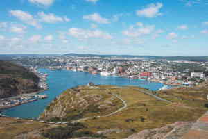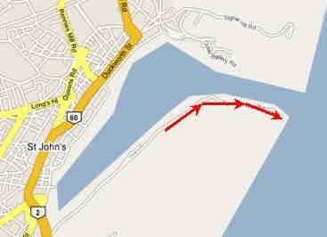 セントジョーンズ滞在最後の日、セントジョーンズ港のまわりを歩いてみた。 歩いたのは、下の写真の左側である。左側の左はずれが港の出口。その先端に灯台がある。 以下の地図は歩いた順路。矢印の先端が灯台であり、対岸はシグナルヒル、海側は北大西洋である。 ![]() 下はセントジョーンズ市街地の反対側から市街地をとった写真である。 港にたくさんの旅客船や漁船が停泊している。 この港は自然の地形を利用した水深もある良好な港で、その昔は軍港としても遣われていたという。