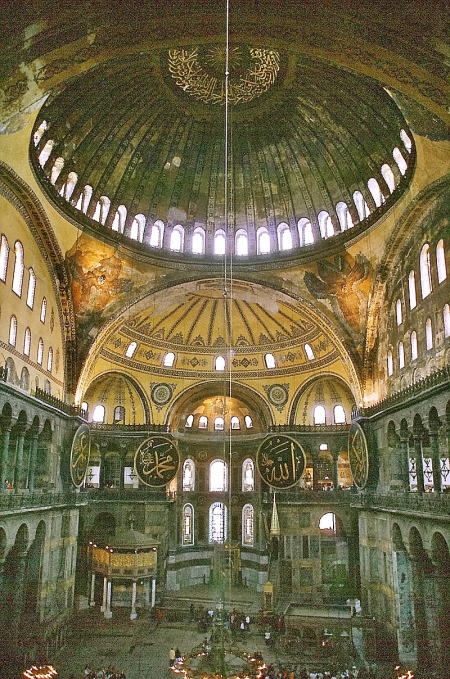 | 総合メニュー(西アジア) モスク アヤソフィア1 アヤソフィア2 アヤソフィア3 アヤソフィア4 アヤソフィア5 アヤソフィア6 アヤソフィア7 次はイスタンブルのアヤソフィア2です。 ◆アヤソフィア2 歴史 創建 アヤソフィアは、元来キリスト教の大聖堂です。最初の聖堂は、首都コンスタンティノープル(コンスタンティノポリス)にコンスタンティヌス大帝の子コンスタンティウス2世の手によって350年頃に建設が始まり360年2月15日に、アリウス派僧侶の司教アンティオキアのユードクシウスによって]献堂されました。 単に大教会(メガリ・エクリシア)と呼ばれており、聖堂は再建されても常に巨大なものであったため、以後もほとんどこのように呼ばれています。最初の教会堂は木造屋根をもったバシリカだったらしく、「偉大な教会」(Μεγάλη Ἐκκλησία (Megálē Ekklēsíā, "Great Church"))またはラテン語で「Magna Ecclesia」と呼ばれました。これは、都市内にあったどの教会よりも大きな建物であったためです。今日ではその位置しか知られていません。 404年にコンスタンティノープル大主教ヨアンネス・クリュソストモス追放に伴う争乱でこの聖堂が焼失すると、テオドシウス2世によってすぐに再建が行われ、415年に献堂されました。この聖堂も現在のものとは全く違うバシリカであり、現在でも一列の円柱と柱基、装飾された梁が残っています。 しかし、この聖堂も 532年1月の首都市民の反乱(「ニカの乱」)における放火で、皇帝宮殿の一部やアギア・イリニ聖堂とともに再び焼失してしまいます。 コンスタンティノープルのソクラテスが440年に記したところによると、教会は346年にコンスタンティウス2世によって建設されたといいます。しかし7世紀 - 8世紀以降からの口伝では、この大建築物はコンスタンティヌス大帝によって建てられたといいます。ヨハネス・ゾナラス(英語版)は2つの説を整合させ、コンスタンティウス2世はニコメディアのユーセビウスが献納した建物が壊れたため修理をしたのだと述べました。 ユーセビウスは339年から341年にコンスタンティノープルの司教職を務め、大帝は337年に亡くなっているため、最初の教会が大帝によって創建されたという考えは可能です。この最初の教会は、コンスタンティノープル大主教のヨアンネス・クリュソストモスが皇帝アルカディウスの妃アエリア・エウドキアと対立し404年6月20日に追放処分に科せられた後に発生した暴動で焼失しました。 現在に至る構築 ![]() アヤソフィア大聖堂の内部 Source: Wikimedia Commons 2度の焼失を経た後、ユスティニアヌス帝はただちに再建することを決定し、その設計を技師(ミヒャノピオスまたはミヒャノコス)トラレスのアンテミオスとミレトスのイシドロスにゆだねると、金に糸目をつけず世界中から工員を集め、工事開始を急かしました。 過去のパジリカ復旧ではなく全く新たに設計され直した大聖堂の建設過程は、プロコピオスによって詳細に報告されています。両者は地表の水平面を正確に計測し、ドームを支える主支柱を煉瓦ではなく大型の石材で造成することによって、クリープによる変形や乾燥収縮がおきないようにしました。 このように緻密に建設を進めたにも関わらず、ドーム下部のアーチ架構に差し掛かると建物は変形し始め、各所で亀裂や破壊がおこったとされています。プロコピオスによると、東側の大アーチの工事が完成しないうちにこれを支える主柱が外側に傾き始め、また、南と北のアーチは養生段階で下部のティンパヌムに過大な荷重をかけたため、窓の円柱か2階廊下の円柱が破壊し始めました。それでも、巨大なバットレスをドーム直下にまで補強するなどの方法によって41.5 mの高さのドームは建設されました。 工事は5年11か月という短期間で終了し、 537年12月27日、ユスティニアヌス帝を迎え、総主教メナスによる献堂式を迎えました。この時ユスティニアヌスは、古代イスラエル王国のソロモン王の神殿を凌駕する聖堂を建てたという思いから、 「ソロモンよ、余は汝に勝てり!」と叫んだと伝えられています。プロコピオスは著書『建築について』にて、計算された巧みな比率を持ち、比率陽光が豊かに差し込む会堂内部を「美の伝道」と称え、中央の半球状ドームはまるで金の鎖で天空から吊るされたようだと感想を述べました。 しかし、計画では真円になるはずだったドームは、建築中の歪みによって南北に2 m程度長い楕円形になっており、また、ドーム基部に現在よりも大きな開口部を設けていたため、553年から頻発した地震によって亀裂を生じました。 特に557年12月14日の地震によって聖堂は大きなダメージを受け、558年5月7日に東側のアーチと半ドーム、そして中央ドームの半分が崩壊しました。この崩落の主な原因は、非常に重い支持構造と、平たいドームの重さによる強いせん断荷重であったためです。これらがドームを支えていたアーチに変形を引き起こしました。 再建工事は直ちに着手