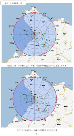 | 大飯原発事故時の北(N)風、2m/sのシミュレーション 出典:青山貞一、鷹取敦、環境総合研究所(東京都品川区) 転載禁 |