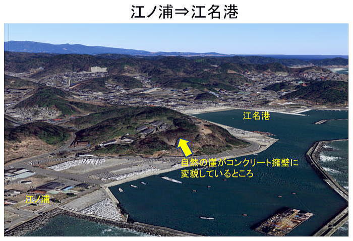 | <総合メニューへ> いわき市勿来 須賀海岸 勿来・岩間 小名浜港・中之作 江ノ浦・江名港 江名走出 合磯・豊間海岸 薄磯海岸 四倉海岸 ◆中之作港から江名港に向かう途中の堤防の整備状況 中之作港から江名港に向かう途中、下の写真にある江ノ浦(港)があった。 ![]() 出典:グーグルマップ3次元図より池田こみちが作成 以下は江ノ浦港に整備された防波堤である。 ![]() 撮影:青山貞一 Nikon Coolpix S9900 ![]() 撮影:青山貞一 Nikon Coolpix S9900 ![]() 撮影:池田こみち Nikon Coolpix S9900 江ノ浦の津波遡上高は6.74mと6.79mであった。 出典:福島県現地調査 http://www.coastal.jp/ttjt/index.php ![]() 撮影:青山貞一 Nikon Coolpix S9900 ![]() 撮影:青山貞一 Nikon Coolpix S9900 ◆江名港 出典:グーグルマップ 以下は江名港の写真。 ![]() 撮影:池田こみち Nikon Coolpix S9900 ![]() 出典:グーグルストリートビュー ![]() 出典:グーグルストリートビュー 折戸地区,江名漁港の 浸水高は 6.3, 6.8 m (TP) である 福島県の資料によると「江名(えな)港は、地形的に恵まれた船溜まりを形成していたため、昔から小型漁船の基地として、活用されてきました。大正10年、県費補助による港湾修築第1期工事に着手して以来、船溜まりや防波堤といった港湾施設の拡充を図り、今では沿岸・沖合漁業の基地として重要な役割を果たしています」とあります。 同資料によると、以下のとおりです。平成27年分 港湾調査では、年間わずか3隻、 453トンとなっています。魚類は沖合底引びき網で主たる魚種はかれい、きちじです。 江名港の入港船舶 (平成27年分 港湾調査 国交省公表資料)