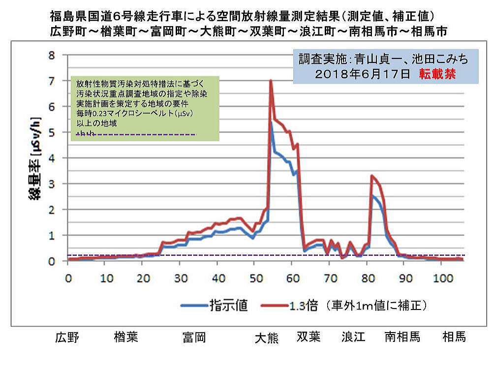 | <総合メニューへ> 久ノ浜・末続 原発立地自治体放射線量 新地町1 新地町2 相馬市松川浦 相馬市大洲松川線 南相馬市沿岸部 飯舘村(放射線量) 久々の会津若松 ◆原発直近自治体を走る国道6号線上1m高に おけるの空間放射線量率の連続測定 2018年6月17日夕方、私たちはいわき市の久之浜、未続地区を現地調査後、国道6号線で広野町、楢葉町、富岡町、大熊町、双葉町、浪江町、南相馬市、相馬市の順に北に向かった。 周知のように2011年3月、過酷な事故を起こした東京電力の福島第一原子力発電所は、大熊町の太平洋岸にある。また事故は起こさなかったが東京電力の福島第二原子力発電所は、富岡町の太平洋岸にある。 一般道路の国道6号線は、楢葉町から南相馬市の小高区の間、2015年まで一般車両は通行禁止だったが、今回の現地調査時は、帰還困難区域に車が入らない限り、通行が可能となっていた。 そこで下図にある国道6号線を南の広野町から相馬市まで、池田こみちがほぼ一定速度でトヨタプリウスで走行し、ほぼ地上1mの高さで青山貞一が米国製の空間放射線量計により空間放射線量率を測定した。 測定対象は主にガンマー線(γ線)である。ガンマ線(γ線、英: gamma ray)は、放射線の一種で、その実体は波長がおよそ 10 pm よりも短い電磁波である。ガンマー線は放射性物質が核分裂する際に放出される放射線である。 放射性核種の半減期 ヨウ素 129 1870万年間 ヨウ素 131 8日間 ヨウ素 133 20.8時間 セシウム 134 2年間 セシウム 136 13.1日間 セシウム 137 30年間 ![]() 出典:放射能の正しい理解 なお、線量計は米国製のDOSE RAE2。 ![]() 出典:グーグルマップ 下の写真は測定に使った環境総合研究所(東京都目黒区大岡山)所有のトヨタプリウスの同型車である。車高は1490mmである。 ![]() 出典:トヨタ自動車 測定者である青山が助手席に座った状態で計測する高さがほぼ1mとなる。 ![]() 撮影:青山貞一 Nikon Coolpix S9900 下の地図のピンクゾーンは、帰還困難区域である。国道6号線は薄い緑(黄緑色)の線である。E6は常磐自動車道(拘束高速道路)である。今回の調査では、常磐自動車道より2から5kmほど海側で福島第一原発に近い国道6号線上を走行した。 ![]() 出典:NEXCO東日本 以下は調査の始点近くの広野町の写真である。 ![]() 撮影:青山貞一 Nikon Coolpix S9900 下の写真は、国道6号線の大熊町で撮影したものである。国道6号線から左右の一般道路への侵入はいずれも通行制限中(一般車両は実質禁止)であった。 ![]() 撮影:青山貞一 Nikon Coolpix S9900 以下のグーグル衛星地図は、東京電力福島第一原発と国道6号線の位置関係を示している。最も近いところは大熊町長者原付近(常磐線の大野駅と双葉駅の間)で福島第一原発の敷地から国道6号線に約1kmの距離にある。 ![]() 出典:グーグルマップ(名メンズ) ![]() 出典:グーグルマップ(3D立体図) 下は双葉町役場近くを通過時のナビである。時刻は17時16分である。 ![]() 撮影:青山貞一 Nikon Coolpix S9900 下は福島県双葉町の下条地区通過時に撮影した写真。時間は17時17分である。 ![]() 撮影:青山貞一 Nikon Coolpix S9900 以下のグラフは福島県国道6号線を走行する乗用車内で測定した空間放射線量率の測定結果である。測定高はほぼGLから1mである。グラフ中、青線は実測値であり、赤線は車外/車内の比を1.3とした場合の放射線量率である。 ※ 車外/車内の比は、当日及び翌日の飯舘村での実測結果に加え、 一般的遮蔽率である0.8(=1.25)を考慮し、ここでは1.3とした。 またグラフには、0.23μSv/hの位置に破線を入れてある。この値は、放射性物質汚染対処特措法に基づく汚染状況重点調査地域の指定や除染実施計画を策定する地域の要件毎時0.23マイクロシーベル ト(μSv)である。 |