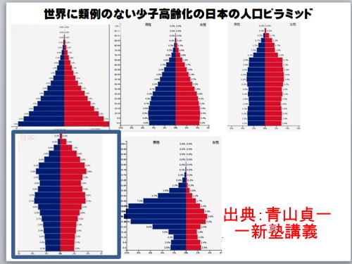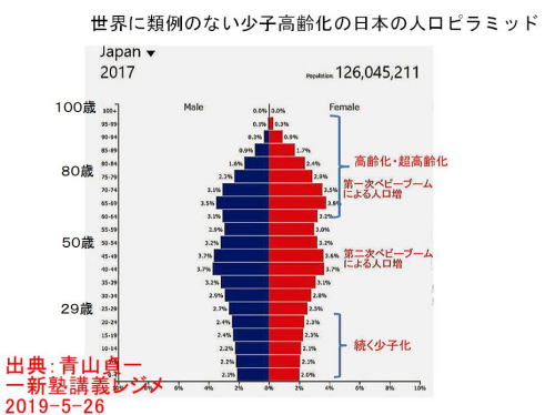 ◆青山貞一プロフ(フェイスブックより) 一新塾代表理事、環境総合研究所顧問、環境行政改革フォーラム代表、ゴミ弁連顧問、東京都市大学名誉教授、早稲田大学理工学部、同教育学部、東京工業大学大学院総合理工学研究科、東京農工大学農学部、中央大学理工学部、法政大学工学部、福島大学行政社会学部、宇都宮大学教育学部など日本各地の多くの大学で環境政策を担当(本務以外の講義の場合は、半期で13−14回講義担当)。行政関係では長野県知事顧問、長野県環境保全研究所所長などを兼務。専門は文系では環境政策、公共政策、行政訴訟、理系では応用物理、3次元流体力学(大気、潮流)、有害化学物質汚染解析など。環境影響評価解析など。その他、2003年より独立メディア E-wave Tokyo、また2010年からFacebookを池田こみち氏と共同、連携して開設、現在に至っている。 <関連スレッド:一新塾 国 経済> 以下は2019年5月26日、東京都千代田区神田のYMCA9階大ホールで行われたの政策学校一新塾入卒塾における青山貞一の冒頭講義の要旨です。 , それぞれのテーマにつき、15〜20枚のパワーポイント(全体で106枚)を使ってお話ししました。なお、今回で塾生は累積5400名となっています。 以下は平成年間(30年間)における日本の課題の総括編(約25分)です。 ![]() ![]() ![]() ![]() ![]() ![]() ![]() ![]() 以下は2018年のドル建て対GDP1996年比(倍率)です。原データはIMF、作成は三橋貴明TVです。ご覧になればわかるように、この22年間、日本は1.0すなわちGDPが一切増えていないことを示しています。ちなみに中国は15.5倍、インド6.8倍、ロシア3.9倍、韓国2.7倍、米国2.5倍、ドイツ1.6倍です。衝撃的なデータですが、日本はその間、国民の実質賃金はおしなべて増えていないことになります。 ![]() 出典:三橋貴明TV 2000年から2014年、日本はリーマンショック後、デフレが継続、一人当たりGDPも増えるどころか減少し、世界300都市圏のうち、大東京圏(人口約3800マン人)でさえ、以下のように一人当たGDP(ppp)と雇用の伸び率は、212位となっていた。平成年間における日本における実質賃金は、一人当たりGDP同様、あがるどころか下がっている実態がある。 <参考> ◆一人当たりGDPと雇用で見た世界300都市ランキング ブルッキングス研究所編 青山貞一訳 ![]() 出典米国ブルッキングス研究所 ![]() ◆国民年金機構(GPIF)による株下落による大損失 少子高齢化はことの初めから日本政府自身が120%わかっていことであるにもかかわらず、関連する政策をさぼってきたいわばツケである。GPIFの破綻も当然分かっていたにもかかわらず、まともな対応をせず、こともあろうかGPIFが株式運用に入れ込み2018年12月末に15兆円規模の損失となっている。 年金積立金管理運用独立行政法人(GPIF)によると、2018年12月末の運用資産額は150兆6630億円と、3・四半期ぶりの減少となった。年末にかけ世界的な株安に見舞われ、四半期ベースで14兆8039億円と過去最大のマイナス運用となったことが響いた。運用資産のうち外国債券は1兆9100億円買い越した。10─12月の収益率はマイナス9.06%。四半期ベースの損失額としては自主運用を始めた01年度以降で最大だった。資産別では、国内債券の収益率が1.01%(4242億円)のプラスだったのに対し、国内株式が17.57%(7兆6556億円)、外国債券が2.74%(7182億円)、外国株式15.71%(6兆8582億円)と、いずれもマイナスだった。 出典:[東京 1日 ロイター] ![]() <参考> ◆論文 青山貞一・池田こみち:人口ピラミッドから見える世界各地、国家の現状と将来 ![]() 出典:論文 青山貞一・池田こみち:人口ピラミッドから見える世界各地、国家の現状と将来