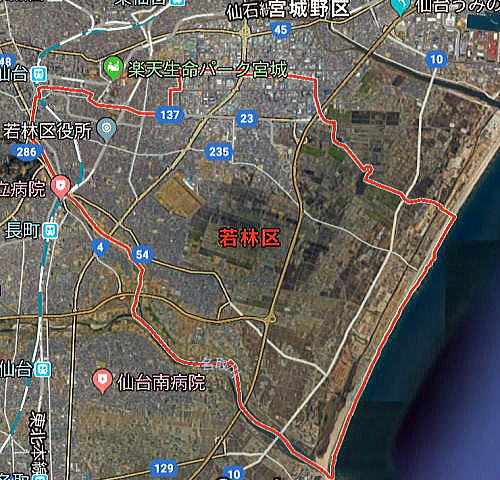 以下は仙台市若林区である。南には名取市、北には仙台市の宮城野区がある。