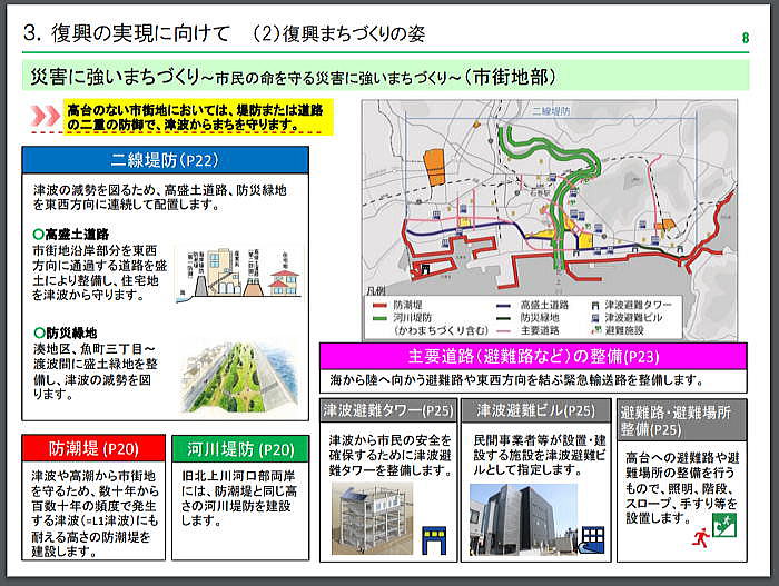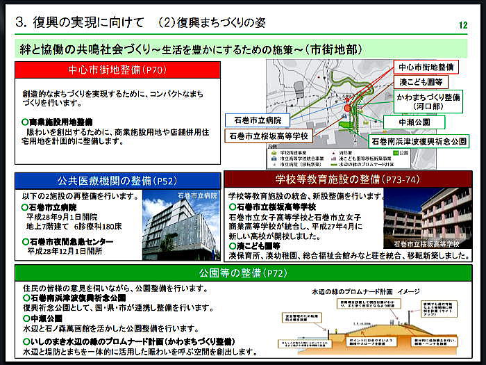 | <総合メニューへ> 石巻市1 石巻市2 石巻市3 石巻市4大川小1 石巻市5大川小2 石巻市6大川小3 石巻市7大川小4訴訟 石巻市8長面1 石巻市9長面2 石巻市10雄勝1 石巻市11雄勝2 女川町1 女川町2 女川町3原発 女川町4原発 ◆石巻市沿岸2 ![]() 出典:東北地方太平洋沖地震を教訓とした地震・津波対策に関する専門調査会配付資料 以下は石巻市の復興計画の概要である。今回の石巻市復興調査は、以下の図では発展期に入っている。しかし、石巻市街、大川、長面、雄勝などの各地を視察した限りでは、発展期はごく一部であり、大部分は再生期にあるように見えた。 ![]() 出典:石巻市東日本大震災からの復興 「最大の被災都市から世界の復興モデル都市を目指して」 復興の実現に向けて ![]() 出典:石巻市東日本大震災からの復興 「最大の被災都市から世界の復興モデル都市を目指して」 復興の実現に向けて ![]() 出典:石巻市東日本大震災からの復興 「最大の被災都市から世界の復興モデル都市を目指して」 復興の実現に向けて ![]() 出典:石巻市東日本大震災からの復興 「最大の被災都市から世界の復興モデル都市を目指して」 復興の実現に向けて ![]() 出典:石巻市東日本大震災からの復興 「最大の被災都市から世界の復興モデル都市を目指して」 復興の実現に向けて ![]() 出典:石巻市東日本大震災からの復興 「最大の被災都市から世界の復興モデル都市を目指して」 復興の実現に向けて ![]() 出典:石巻市東日本大震災からの復興 「最大の被災都市から世界の復興モデル都市を目指して」 復興の実現に向けて ![]() 出典:石巻市東日本大震災からの復興 「最大の被災都市から世界の復興モデル都市を目指して」被災状況 石巻市3につづく |