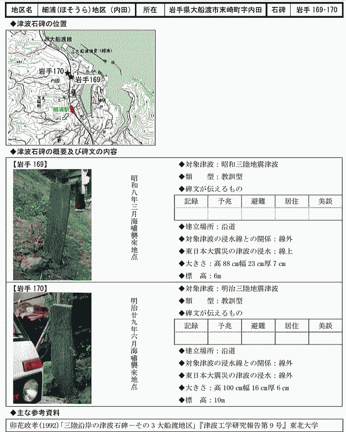 | <総合メニューへ> 陸前高田1 陸前高田2 陸前高田3 陸前高田4 陸前高田5 陸前高田6 陸前高田7 大船渡1 大船渡2 大船渡3 大船渡4 大船渡5 大船渡6 ◆大船渡市6 ![]() 出典:東北地方太平洋沖地震を教訓とした地震・津波対策に 関する専門調査会配付資料 ◆津波来襲時の碑石、供養塔など2 以下は三陸地域に現存する津波石碑の数々である。 ![]() 出典:グーグルマップ 以下は、岩手県大船渡市に残る津波の碑の続きである。 ![]() ![]() ![]() ![]() ![]() 釜石小白浜1へつづく <総合メニューへ> |