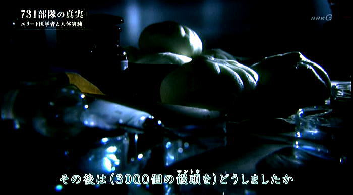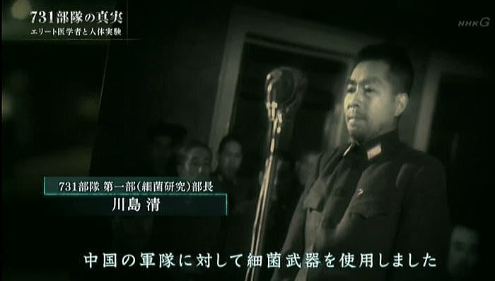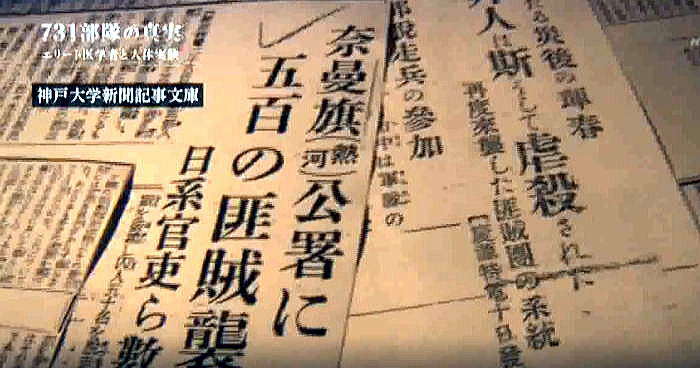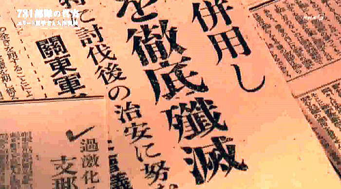 以下は2017年8月に2度放映されたNHKドキュメント「731部隊の真実」の本編のその5です。 ![]() 出典:NHKドキュメント「731部隊の真実」、2017年8月13日、放映 <日本軍兵隊集合写真> 生きた人間を実験材料にした医学者達。本来人の命を守るべき医学者がなぜ一線を超えたのか。 ![]() 出典:NHKドキュメント「731部隊の真実」、2017年8月13日、放映 <野外行軍の写真> それを後押ししたと見られるのが日本国内の世論です。 ![]() 出典:NHKドキュメント「731部隊の真実」、2017年8月13日、放映 <回る年表 1936年731部隊編成 1937年 日中戦争> 1937年日中戦争が勃発。中国側の激しい交戦で日本側も犠牲が増えていきます。 ![]() 出典:NHKドキュメント「731部隊の真実」、2017年8月13日、放映 <野外実験の様子> 匪賊:日本に反発する現地住民 日本軍は反発する中国人等を匪賊と呼び、掃討作戦を行っていきます。 ![]() 出典:NHKドキュメント「731部隊の真実」、2017年8月13日、放映 <新聞の見出し:神戸大学新聞記事文庫> 奈曼旗(熱河)公署に五百の匪賊襲来 政府もメディアも日本の犠牲を強調し、中国人への憎悪を駆り立てました。 ![]() 出典:NHKドキュメント「731部隊の真実」、2017年8月13日、放映 <新聞見出し;徹底殲滅> 暴虐極まる匪賊。匪賊を徹底殲滅。 ![]() 出典:NHKドキュメント「731部隊の真実」、2017年8月13日、放映 <中国人を連れた日本軍> 世論は軍による処罰を強く支持。匪賊に対する敵意が高まっていたのです。 そうした時代の空気と研究者は無縁ではありませんでした。 ![]() 出典:NHKドキュメント「731部隊の真実」、2017年8月13日、放映 <北海道大学医学部図書館> 731部隊以外でも、学術界では匪賊を蔑視する感情が広がっていました。 それを示す資料が北海道大学で見つかりました。 ![]() 出典:NHKドキュメント「731部隊の真実」、2017年8月13日、放映 <資料:外國に於ける断種法実施状況> 当時の厚生省が主催する研究会が発行した雑誌です。 染色体を研究する大学教授の講演の記録。 ![]() 出典:NHKドキュメント「731部隊の真実」、2017年8月13日、放映 <染色体の写真> 満州の匪賊を生きたまま研究材料としたことを公に語っていました。 「匪賊が人間を殺すならば、その報復ではないが、その匪賊を材料にしてはどうかと思いついた。」 ![]() 出典:NHKドキュメント「731部隊の真実」、2017年8月13日、放映 <染色体の写真(円形状に番号を示したもの)> 死んだ者は絶対にダメである。染色体の状態が著しく悪くなる。 ![]() 出典:NHKドキュメント「731部隊の真実」、2017年8月13日、放映 <蟻の写真:北海道帝国大学教授の講演録「民族衛生資料」(1940年)> 「匪賊一人を犠牲にしたことは決して無意味ではありません。これほど立派な材料は 従来断じてないということだけは出来ます。」 ![]() 出典:NHKドキュメント「731部隊の真実」、2017年8月13日、放映 <731部隊 元少年隊員 三角武さん> 14歳の時に731部隊に入隊した三角さん。匪賊は死刑囚だから実験材料として利用して良いと教えられたと言います。 ![]() 出典:NHKドキュメント「731部隊の真実」、2017年8月13日、放映 <同上証言> 証言「こういう時代なんだから、そうしなきゃ俺たちがやられるんだよと、そういった考えでしたね。だから口には出せないです。可愛そうだからとか。見ても口には出せないです。出したら非国民だ、とやられちゃう。そういった雰囲気というか、そういった一般的な風潮がそうだったんです。」 ![]() 出典:NHKドキュメント「731部隊の真実」、2017年8月13日、放映 ![]() 出典:NHKドキュメント「731部隊の真実」、2017年8月13日、放映 <空撮> 戦争が泥沼化していった1940年代、731部隊は遂に細菌兵器の実践使用に踏み切ります。中国中部の複数の都市で少なくとも3回、細菌を散布。細菌兵器での攻撃は国際条約で禁止されていましたが、日本は批准しないまま密かに使用しました。 ![]() 出典:NHKドキュメント「731部隊の真実」、2017年8月13日、放映 <731部隊 第一部(細菌研究)部長 川島清の証言> 証言「私がおりました間のことを申しますと、昭和16年に第一回、それから昭和17年に1回。中支において第731部隊は中国の軍隊に対して細菌武器を使用しました。」 出典:NHKドキュメント「731部隊の真実」、2017年8月13日、放映<同上証言 水面に月明かりが反射している> さらに、民間人にまで感染を広げる目的で、中国の集落に細菌を撒いたと証言されています。 証言「使われる細菌は主として、ペスト菌、コレラ菌、オア等チフス菌であることが決定しました。 ![]() 出典:NHKドキュメント「731部隊の真実」、2017年8月13日、放映 <同上証言> 証言「ペスト菌は主としてペスト蚤(ペストに感染させた蚤)の形で使われました。 その他のものはそのまま水源とか井戸とか貯水池というようなところに散布されたのであります。」 ![]() 出典:NHKドキュメント「731部隊の真実」、2017年8月13日、放映 ![]() 出典:NHKドキュメント「731部隊の真実」、2017年8月13日、放映 <731部隊 衛生兵 古都証人の証言−23.> ![]() 出典:NHKドキュメント「731部隊の真実」、20