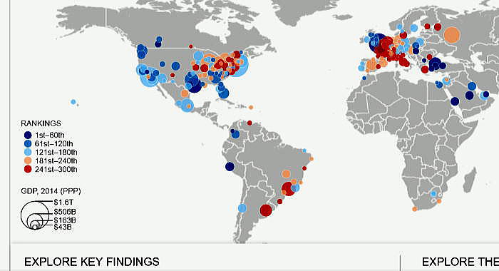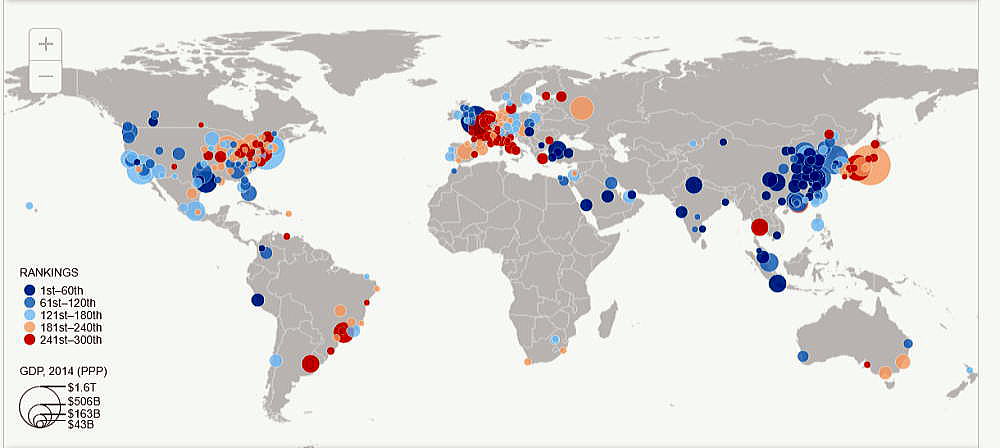 世界300の大都市圏が次のようにランキングされ、色分けされます。