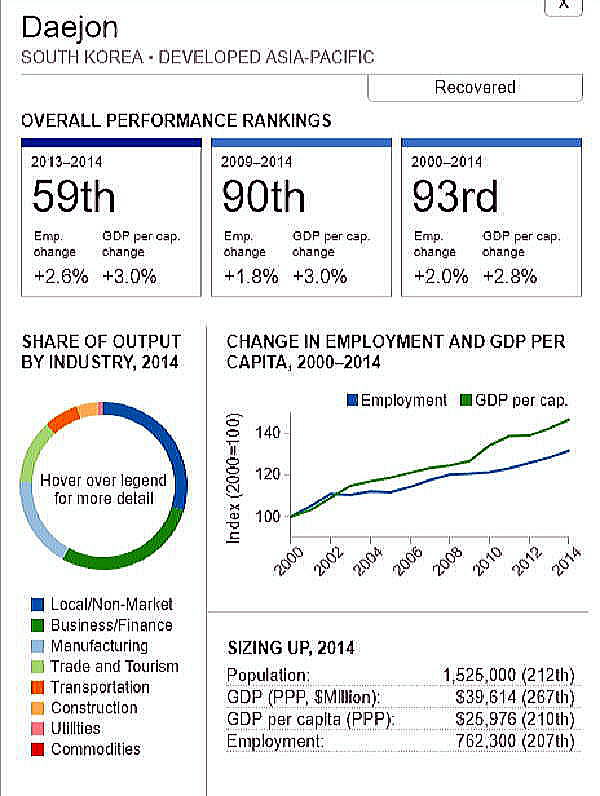 日本・韓国 オリジナル出典:米国ブルッキングス研究所 ここではアジアの日本と韓国の大都市圏について、調査結果(総合、2000年〜2014年)を見てみます。 ![]() 出典ブルッキングス研究所(米国) 以下は日本、韓国の拡大図です。 ![]() 出典ブルッキングス研究所(米国) <世界300都市経済圏ランクマップ> 総合・一人当たりGDP・雇用 ◆日本の大都市圏 以下は日本の主要大都市圏の結果です。残念ながら、すべてが停滞か下降の赤色グループです。 日本の大都市圏の大きな特徴は、2008年9月のいわゆるリーマンショック以降、激しい雇用の落ち込みがあり、一人当たりGDPも落ち込みとなり、なかなかその影響を克服しきれていないことにあります。とりわけ、雇用の落ち込みは、世界300都市圏のいずれより大きなことも判明しました。 また一人当たりのGDPが上がっている割には雇用が少ない点も指摘できます。さらに一人当たりのGDPが上がっていても勤労者の所得が増えていないのは、企業が税引き後利益を内部留保とし、勤労者の所得に再分配していないことにあります。 ●、すなわち一人当り購買力平価の大きさは、東京は世界都市圏で最大規模です。東京の●の大きさは、米国のニューヨーク大都市圏に比肩しており、物価が世界規模で高く、生活がしずらいことを意味しています。また、これは東京が日本の他の都市圏との対比で世界一一極集中化していることが見て取れます。 日本 東京大都市圏(212位/300) ![]() 日本 北九州・福岡大都市圏(246位/300) ![]() 日本 鹿児島都市圏(260位/260) ![]() 日本 名古屋都市圏(264位/300) ![]() 日本 熊本都市圏(267位/300) ![]() 日本 浜松都市圏都市圏(272位/300) ![]() 日本 静岡都市圏(273位/300) ![]() 日本 岡山都市圏(276位/300) ![]() 日本 大阪神戸大都市圏(281位/300) ![]() 日本 広島都市圏(288位/300) ![]() 日本 札幌都市圏(289位/300) ![]() 日本新潟都市圏(290位/300) ![]() 日本 仙台都市圏(293位/300) ![]() 次はお隣の韓国の大都市圏です。 ◆韓国主要都市圏 韓国の特徴は2008年9月のいわゆるリーマンショックの影響を日本ほど受けていないことがあげられます。また雇用の増加と一人当たりGDPがともに増加しています。 韓国 ソウル市・仁川都市圏(91位/300) ![]() 韓国 大田都市圏(93位/300) ![]() 韓国 光州都市圏(94位/300) ![]() 韓国 釜山市・ウルサン大都市圏(119位/300) 市韓国 大邱都市圏(125位/300) ![]() 以上、日本と韓国の順位を見てきましたが、おおよそ以下のことが言えます。すなわち、2000年から2014年の14年間で成長が著しいアジア諸国にあって韓国はその一員でしたが、日本は東京が4位グループにあるだけで、福岡・北九州大都市圏など他は最下位グループと停滞していたことが分かります。 <アジア地域都市圏の分布> 1位から 60位 中国、マカオ、香港、東南アジア、インド、中東 61位から120位 韓国、台湾、東南アジア、インド、トルコ 121位から180位 該当なし 181位から240位 日本 241位から300位 日本 青山貞一コメント(初出フェイスブック) ![]() ![]() つづく 中国へ