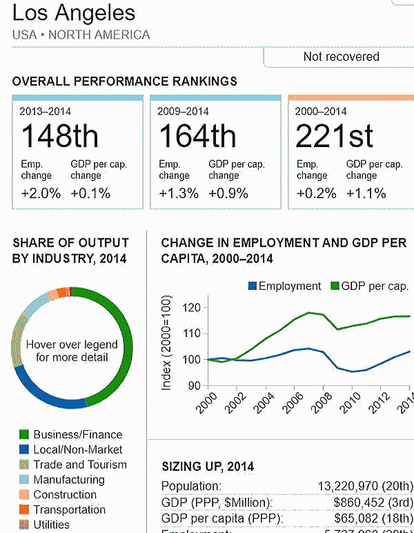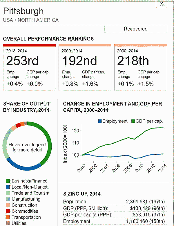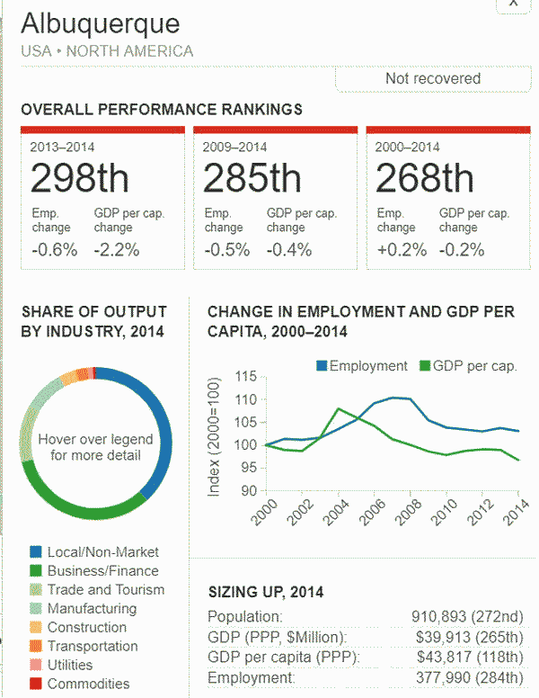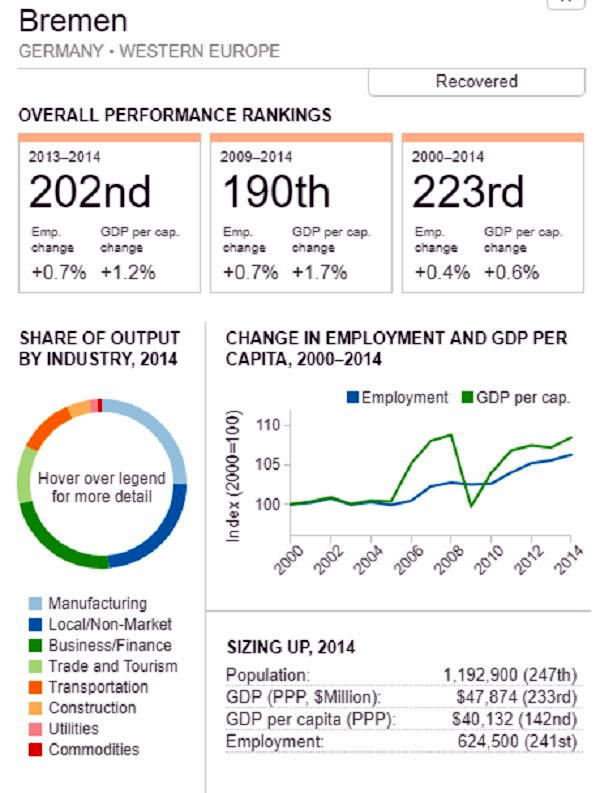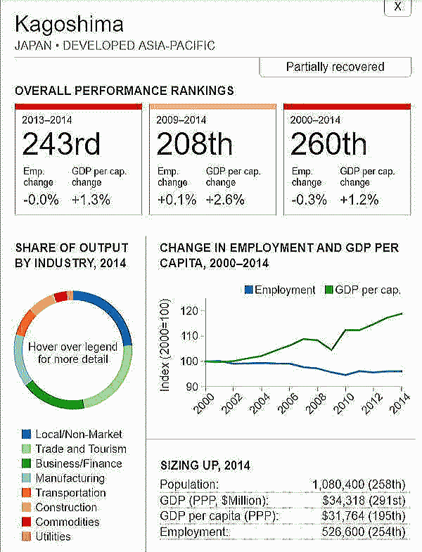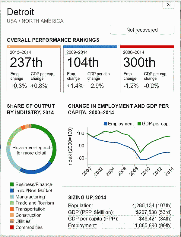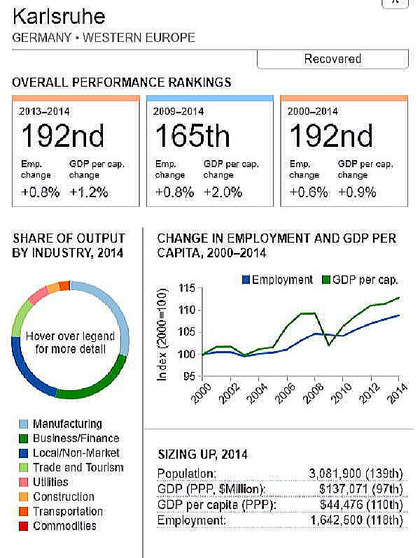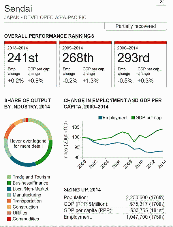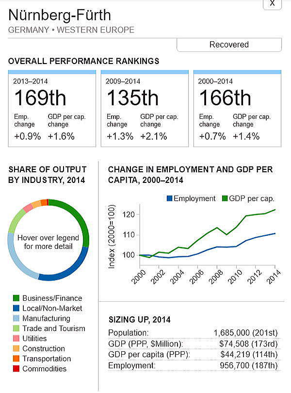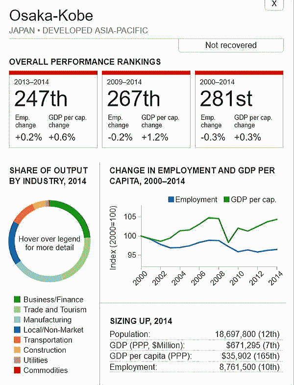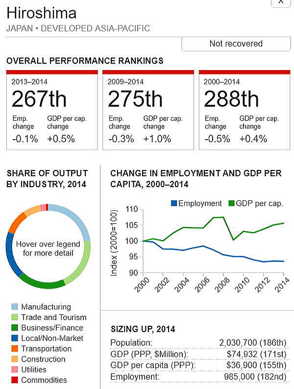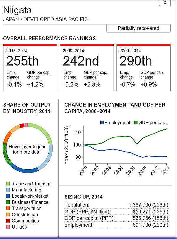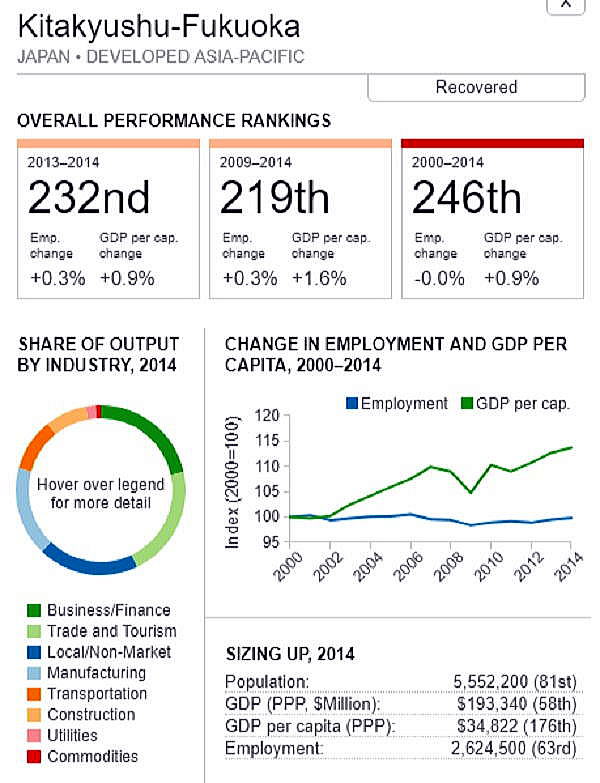 G7 オリジナル出典:米国ブルッキングス研究所 ここではいわゆるG7諸国、すなわち米、英、仏、独、伊、加、日の大都市圏(各3都市圏)について、調査結果(総合、2000年〜2014年)を見てみます。 想定されるのは、G7諸国の経済は行き着くところまで来た、いわば成熟経済社会であり停滞社会であって、中国、東南アジアなどのような高い順位は望めないということです。公表は最後の部分にあります。 G7諸国の大都市圏、都市圏の顕著な特徴は、 2008年9月のいわゆるリーマンショックの影響を受けていることで、以降、激しい雇用の落ち込みがあり、一人当たりGDPも落ち込みとなり、なかなかその影響を克服しきれていないことにあります。 これはグローバル化された経済下にある欧米日本の大都市圏、都市圏が共通に持つ弊害でもあります。多くの都市ではリーマンショックの影響を回復するのに長い年月をようしているだけでなく、それをきっかけに停滞社会となっている都市圏も多くあります。とくに米国のデトロイト都市圏は300都市圏中300位となっています。これはリーマンショックだけでなく、同地の主要産業である自動車工業が日本、ドイツなどからの自動車輸入とあわせ壊滅的な影響を受けていることにあり、トランプ大統領誕生のひとつの要因となっています。 米国デトロイト都市圏(300位/300) ![]() これは日本の都市圏にあっても類似しており、たとえば札幌都市圏では、以下のように雇用が壊滅様態を続けていることが分かります。そしてこれが東京ぢ都市圏への人口流入の遠因となっています。 日本札幌都市圏(289位/300) ![]() そのなかでカナダの諸都市圏は、いずれも最上位グループないし第二位グループにあり、雇用を大幅に改善していますが、一人当たりGDP(ppp)は依然として停滞したままとなっています。 ![]() 出典ブルッキングス研究所(米国)https://www.brookings.edu/research/global-metro-monitor/ ◆G7諸国の大都市圏(各3都市圏) 米国 米国は以下の地図にあるように、青色系と、赤色系が半々と混在していることです。青色系は南部と太平洋岸にあり、一方、赤色系はニューイングランドなど東部、シカゴなどにあり2極化していることが分かります。規模としては、ニューヨークが群を抜いており、その次は、ヒューストンなど多岐にわたっています。 ![]() 出典ブルッキングス研究所(米国) 米国 米国は以下の地図にあるように、青色系と、赤色系が半々と混在していることです。青色系は南部と太平洋岸にあり、一方、赤色系はニューイングランドなど東部、シカゴなどにあり2極化していることが分かります。規模としては、ニューヨークが群を抜いており、その次は、ヒューストンなど多岐にわたっています。 ![]() 出典ブルッキングス研究所(米国) 米国 オースティン都市圏(111位/300) ![]() 米国 ヒューストン大都市圏(118位/300) ![]() 米国 ベーカースフィールド都市圏(132位/300) ![]() 米国 ポートランド都市圏(137位/300) ![]() 米国 ソルトレイクシティー都市圏(138位/300) ![]() 米国 ローリー都市圏(139位/300) ![]() 米国 バトンルージュ都市圏(141位/300) ![]() 米国 サンアントニオ都市圏(118位/300) ![]() 米国 リバーサイド都市圏(150位/150) ![]() 米国 エルパソ都市圏(153位/300) ![]() 米国 オクラホマシテイー大都市圏(156位/300) ![]() 米国 ダーハム都市圏(160位/300) ![]() 米国 ナッシュビル都市圏(162位/300) ![]() 米国 デスモンズア都市圏(163位/300) ![]() 米国 ラスベガス都市圏(164位/300) ![]() 米国 マジソン都市圏(165位/300) ![]() 米国 ワシントンDC大都市圏(167位/300) 青山・池田 ![]() 米国 ダラス大都市圏(168位/300) ![]() 米国・リトルロック都市圏(169位/300) ![]() 米国 オーランド市圏(170位/300)..青山、池田 ![]() 米国 ホノルル大都市圏(171位/300)..青山、池田 ![]() 米国 ボルティモア都市圏(179位/300) ![]() 米国 サンディエゴ大都市圏(181位/300)..青山 ![]() 米国 フェニックス都市圏(183位/300) ![]() 米国 シアトル大都市圏(188位/300)..青山、池田 ![]() 米国 ノックスビル都市圏(193位/300) ![]() 米国 シャーロッテ都市圏(195位/300) ![]() 米国 インディアナポリス都市圏(198位/300) ![]() 米国 タルサ大都市圏(199位/300) ![]() 米国 アレンタウン市圏(200位/300) ![]() 米国 オマサ都市圏(205位/300) ![]() 米国 マイアミ大都市圏(206位/300). ![]() 米国 ニューヨーク大都市圏(207位/300)..青山、池田 ![]() 米国 オックスナード大都市圏(222位/300). ![]() 米国 サクラメント都市圏(210位/300).青山、池田 ![]() 米国 ロサンゼルス大都市圏(218位/300).青山、池田 ![]() 米国 リッチモンド都市圏(219位/300) ![]() 米国 デンバー大都市圏(220位/300).. ![]() 米国 ロサンゼルス大都市圏(221位/300)..青山、池田 ![]() 米国 ボストン大都市圏(224/300) 青山・池田 ![]() 米国 コロンバス都市圏(226位/300) ![]() 米国 アルバニー都市圏(226位/300) ![]() 米国 フレスノ都市圏(230位/300) ![]() 米国 ツーソン都市圏(228位/300) ![]() 米国 ミネアポリス都市圏(235位/300) 青山、池田 ![]() 米バージニアビーチ都市圏(236位/300) ![]() 米国 ジャクソンビル都市圏(237位/300) ![]() 米国 バッファロ