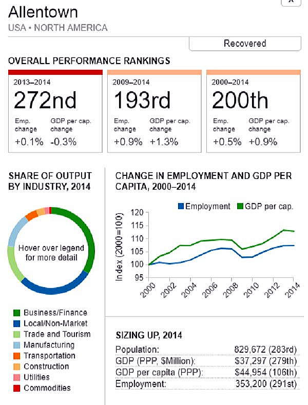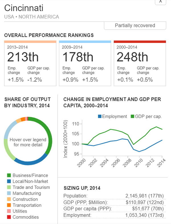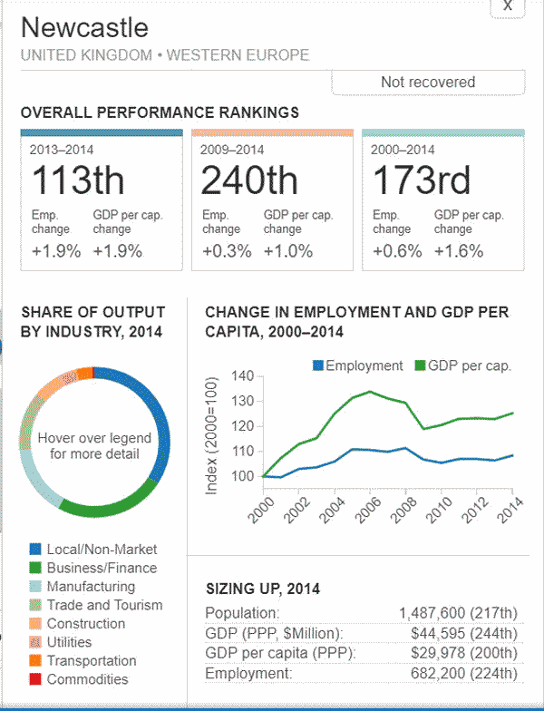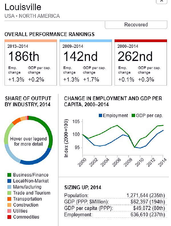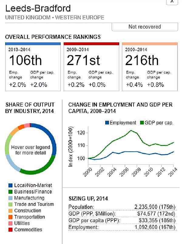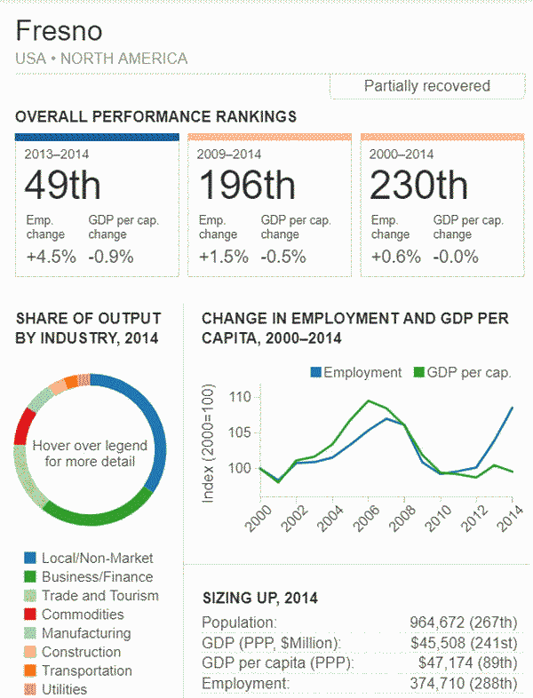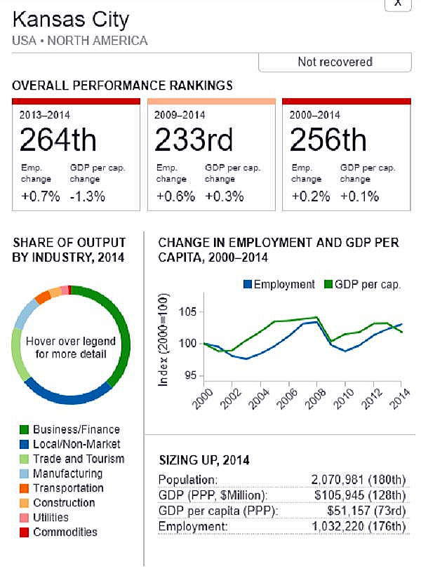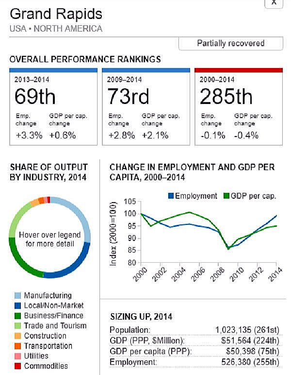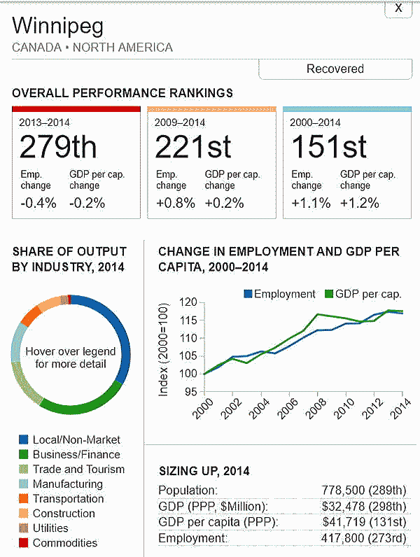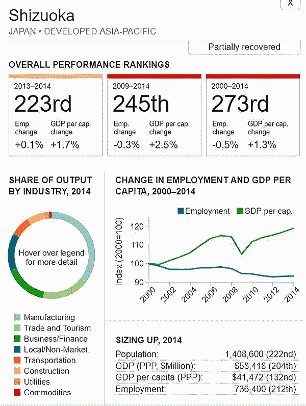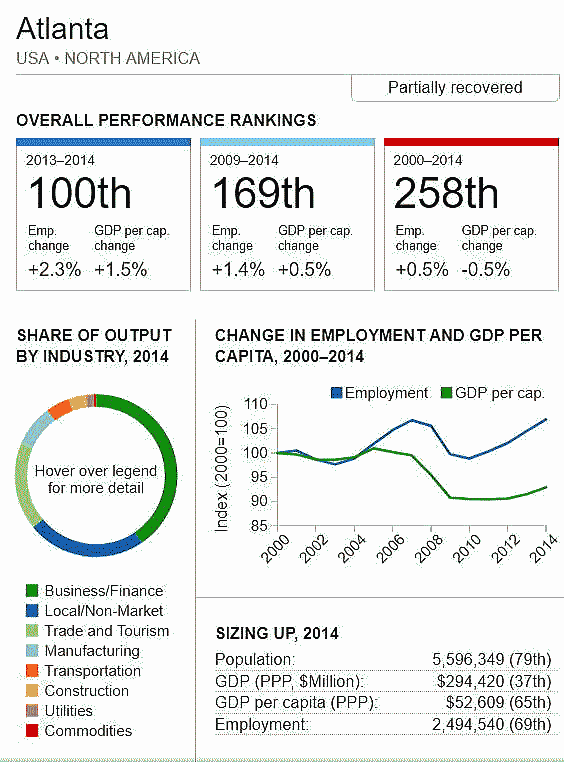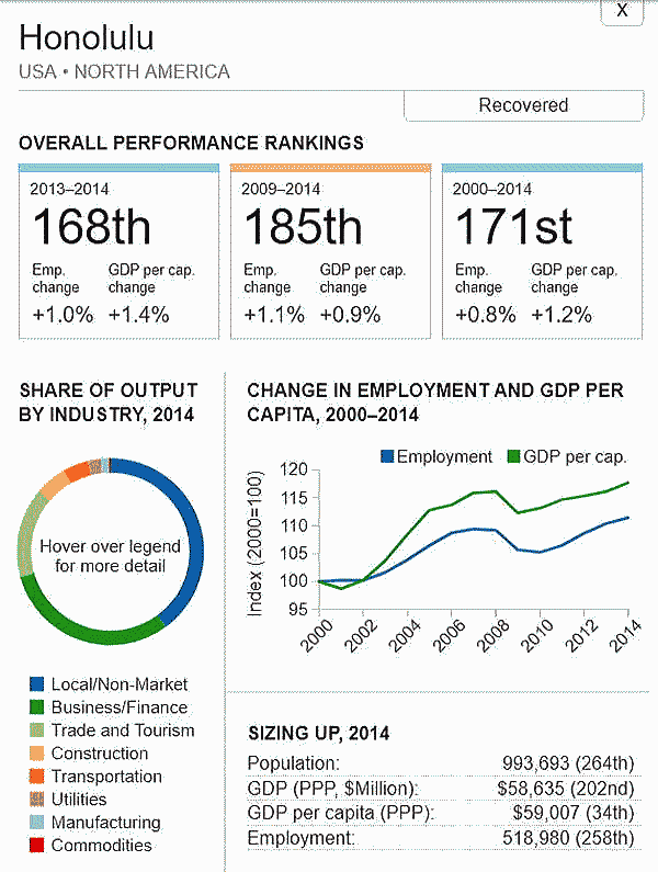 G7 オリジナル出典:米国ブルッキングス研究所 ここではいわゆるG7諸国、すなわち米、英、仏、独、伊、加、日の大都市圏(各3都市圏)について、調査結果(総合、2000年〜2014年)を見てみます。 想定されるのは、G7諸国の経済は行き着くところまで来た、いわば成熟経済社会であり停滞社会であって、中国、東南アジアなどのような高い順位は望めないということです。公表は最後の部分にあります。 G7諸国の大都市圏、都市圏の顕著な特徴は、 2008年9月のいわゆるリーマンショックの影響を受けていることで、以降、激しい雇用の落ち込みがあり、一人当たりGDPも落ち込みとなり、なかなかその影響を克服しきれていないことにあります。 これはグローバル化された経済下にある欧米日本の大都市圏、都市圏が共通に持つ弊害でもあります。多くの都市ではリーマンショックの影響を回復するのに長い年月をようしているだけでなく、それをきっかけに停滞社会となっている都市圏も多くあります。とくに米国のデトロイト都市圏は300都市圏中300位となっています。これはリーマンショックだけでなく、同地の主要産業である自動車工業が日本、ドイツなどからの自動車輸入とあわせ壊滅的な影響を受けていることにあり、トランプ大統領誕生のひとつの要因となっています。 米国デトロイト都市圏(300位/300) ![]() これは日本の都市圏にあっても類似しており、たとえば札幌都市圏では、以下のように雇用が壊滅様態を続けていることが分かります。そしてこれが東京ぢ都市圏への人口流入の遠因となっています。 日本札幌都市圏(289位/300) ![]() そのなかでカナダの諸都市圏は、いずれも最上位グループないし第二位グループにあり、雇用を大幅に改善していますが、一人当たりGDP(ppp)は依然として停滞したままとなっています。 ![]() 出典ブルッキングス研究所(米国)https://www.brookings.edu/research/global-metro-monitor/ ◆G7諸国の大都市圏(各3都市圏) 米国 米国は以下の地図にあるように、青色系と、赤色系が半々と混在していることです。青色系は南部と太平洋岸にあり、一方、赤色系はニューイングランドなど東部、シカゴなどにあり2極化していることが分かります。規模としては、ニューヨークが群を抜いており、その次は、ヒューストンなど多岐にわたっています。 ![]() 出典ブルッキングス研究所(米国) 米国 米国は以下の地図にあるように、青色系と、赤色系が半々と混在していることです。青色系は南部と太平洋岸にあり、一方、赤色系はニューイングランドなど東部、シカゴなどにあり2極化していることが分かります。規模としては、ニューヨークが群を抜いており、その次は、ヒューストンなど多岐にわたっています。 ![]() 出典ブルッキングス研究所(米国) 米国 オースティン都市圏(111位/300) ![]() 米国 ヒューストン大都市圏(118位/300) ![]() 米国 ベーカースフィールド都市圏(132位/300) ![]() 米国 ポートランド都市圏(137位/300) ![]() 米国 ソルトレイクシティー都市圏(138位/300) ![]() 米国 ローリー都市圏(139位/300) ![]() 米国 バトンルージュ都市圏(141位/300) ![]() 米国 サンアントニオ都市圏(118位/300) ![]() 米国 リバーサイド都市圏(150位/150) ![]() 米国 エルパソ都市圏(153位/300) ![]() 米国 オクラホマシテイー大都市圏(156位/300) ![]() 米国 ダーハム都市圏(160位/300) ![]() 米国 ナッシュビル都市圏(162位/300) ![]() 米国 デスモンズア都市圏(163位/300) ![]() 米国 ラスベガス都市圏(164位/300) ![]() 米国 マジソン都市圏(165位/300) ![]() 米国 ワシントンDC大都市圏(167位/300) 青山・池田 ![]() 米国 ダラス大都市圏(168位/300) ![]() 米国・リトルロック都市圏(169位/300) ![]() 米国 オーランド市圏(170位/300)..青山、池田 ![]() 米国 ホノルル大都市圏(171位/300)..青山、池田 ![]() 米国 ボルティモア都市圏(179位/300) ![]() 米国 サンディエゴ大都市圏(181位/300)..青山 ![]() 米国 フェニックス都市圏(183位/300) ![]() 米国 シアトル大都市圏(188位/300)..青山、池田 ![]() 米国 ノックスビル都市圏(193位/300) ![]() 米国 シャーロッテ都市圏(195位/300) ![]() 米国 インディアナポリス都市圏(198位/300) ![]() 米国 タルサ大都市圏(199位/300) ![]() 米国 アレンタウン市圏(200位/300) ![]() 米国 オマサ都市圏(205位/300) ![]() 米国 マイアミ大都市圏(206位/300). ![]() 米国 ニューヨーク大都市圏(207位/300)..青山、池田 ![]() 米国 オックスナード大都市圏(222位/300). ![]() 米国 サクラメント都市圏(210位/300).青山、池田 ![]() 米国 ロサンゼルス大都市圏(218位/300).青山、池田 ![]() 米国 リッチモンド都市圏(219位/300) ![]() 米国 デンバー大都市圏(220位/300).. ![]() 米国 ロサンゼルス大都市圏(221位/300)..青山、池田 ![]() 米国 ボストン大都市圏(224/300) 青山・池田 ![]() 米国 コロンバス都市圏(226位/300) ![]() 米国 アルバニー都市圏(226位/300) ![]() 米国 フレスノ都市圏(230位/300) ![]() 米国 ツーソン都市圏(228位/300) ![]() 米国 ミネアポリス都市圏(235位/300) 青山、池田 ![]() 米バージニアビーチ都市圏(236位/300) ![]() 米国 ジャクソンビル都市圏(237位/300) ![]() 米国 バッファロ