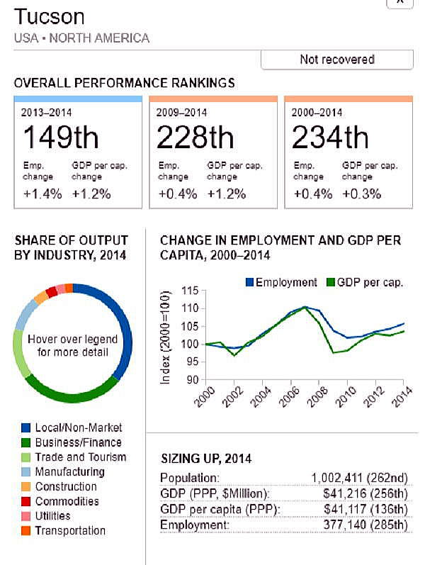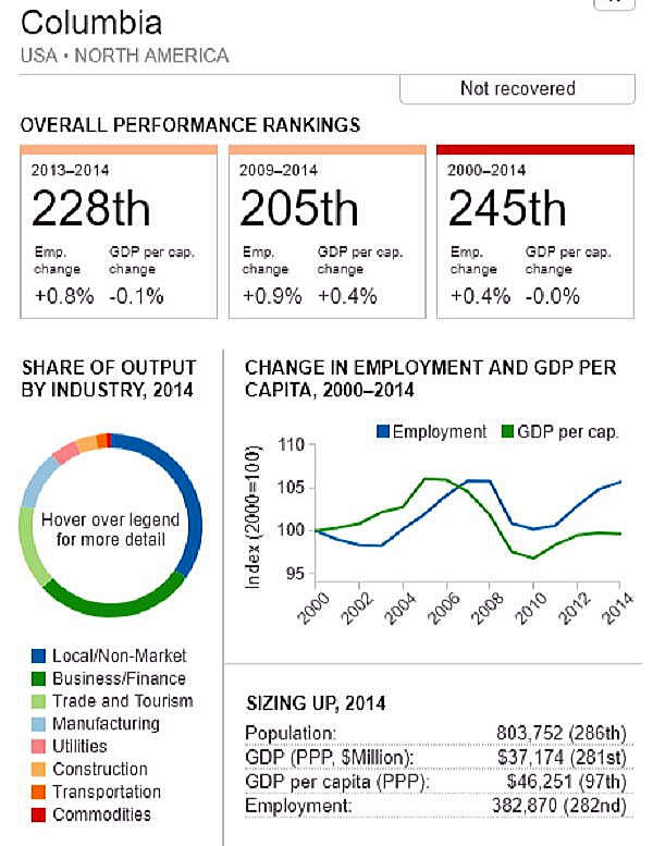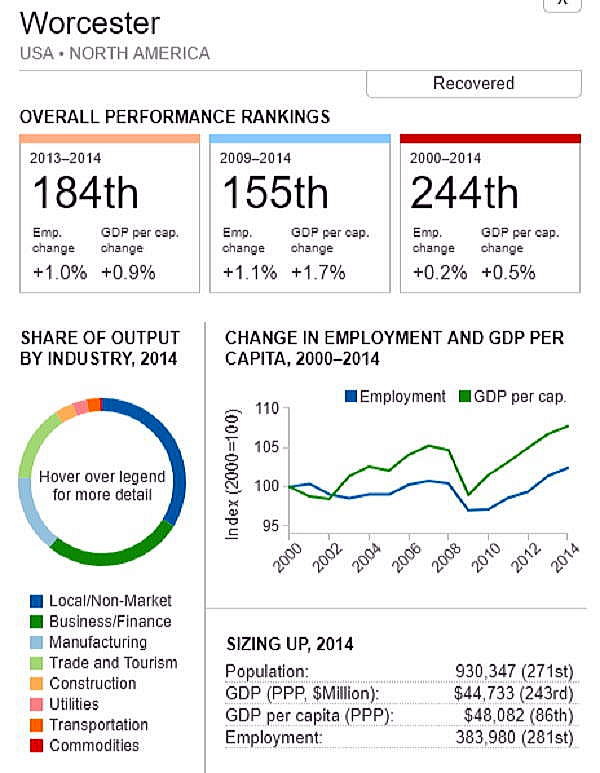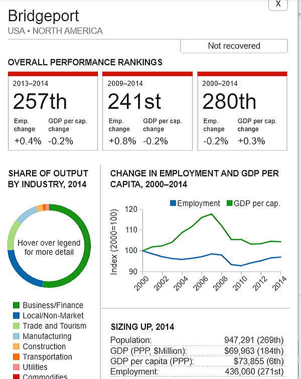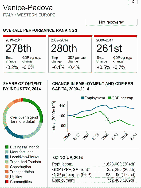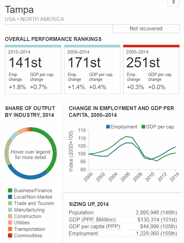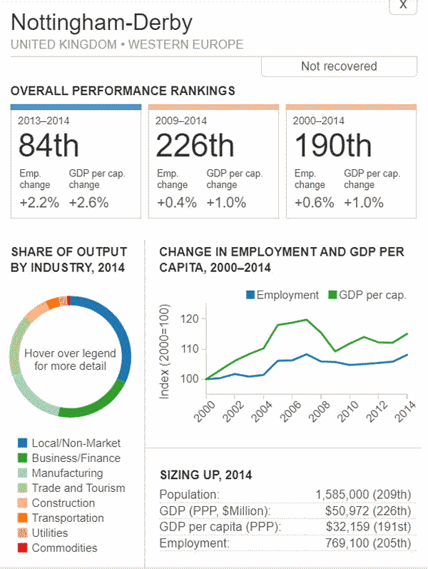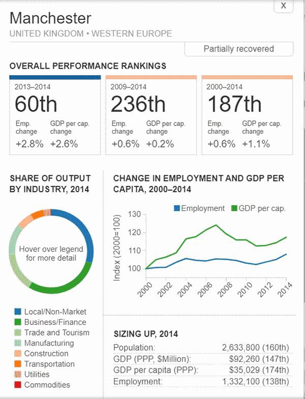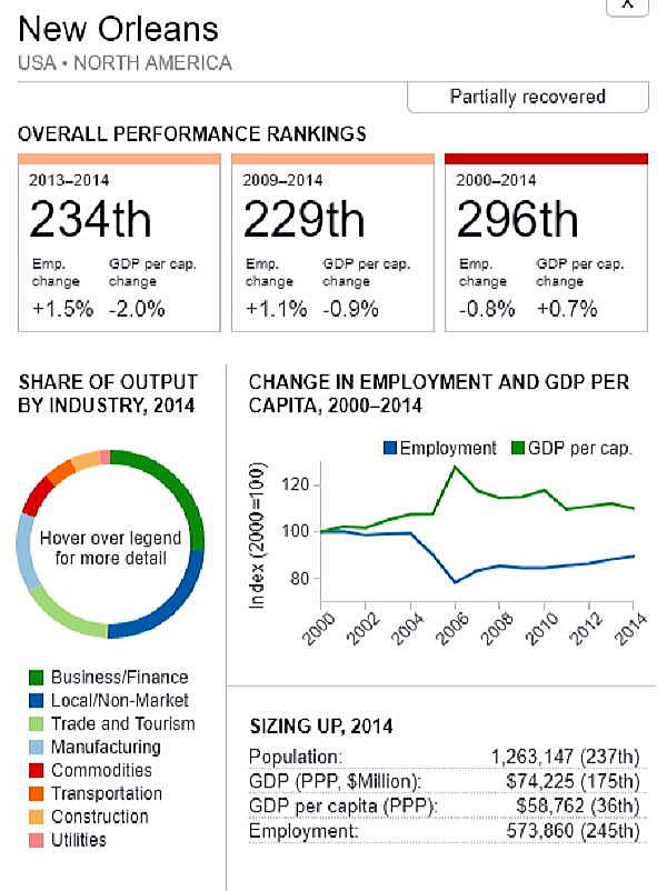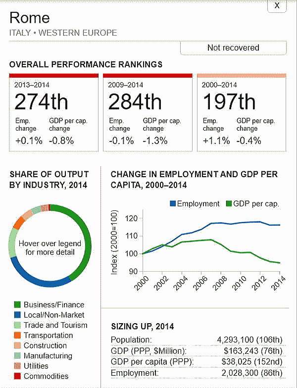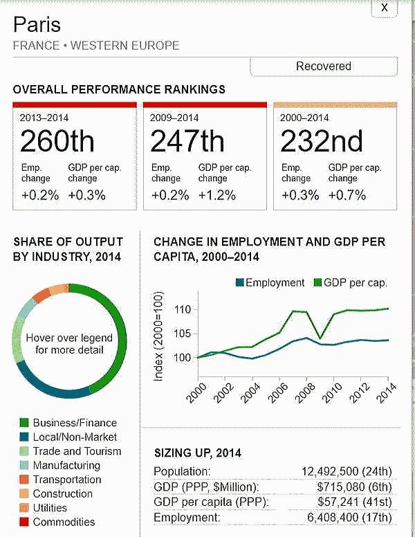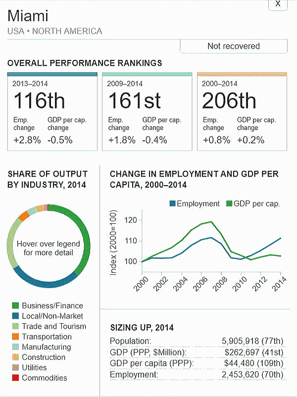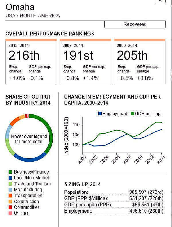 G7 オリジナル出典:米国ブルッキングス研究所 ここではいわゆるG7諸国、すなわち米、英、仏、独、伊、加、日の大都市圏(各3都市圏)について、調査結果(総合、2000年〜2014年)を見てみます。 想定されるのは、G7諸国の経済は行き着くところまで来た、いわば成熟経済社会であり停滞社会であって、中国、東南アジアなどのような高い順位は望めないということです。公表は最後の部分にあります。 G7諸国の大都市圏、都市圏の顕著な特徴は、 2008年9月のいわゆるリーマンショックの影響を受けていることで、以降、激しい雇用の落ち込みがあり、一人当たりGDPも落ち込みとなり、なかなかその影響を克服しきれていないことにあります。 これはグローバル化された経済下にある欧米日本の大都市圏、都市圏が共通に持つ弊害でもあります。多くの都市ではリーマンショックの影響を回復するのに長い年月をようしているだけでなく、それをきっかけに停滞社会となっている都市圏も多くあります。とくに米国のデトロイト都市圏は300都市圏中300位となっています。これはリーマンショックだけでなく、同地の主要産業である自動車工業が日本、ドイツなどからの自動車輸入とあわせ壊滅的な影響を受けていることにあり、トランプ大統領誕生のひとつの要因となっています。 米国デトロイト都市圏(300位/300) ![]() これは日本の都市圏にあっても類似しており、たとえば札幌都市圏では、以下のように雇用が壊滅様態を続けていることが分かります。そしてこれが東京ぢ都市圏への人口流入の遠因となっています。 日本札幌都市圏(289位/300) ![]() そのなかでカナダの諸都市圏は、いずれも最上位グループないし第二位グループにあり、雇用を大幅に改善していますが、一人当たりGDP(ppp)は依然として停滞したままとなっています。 ![]() 出典ブルッキングス研究所(米国)https://www.brookings.edu/research/global-metro-monitor/ ◆G7諸国の大都市圏(各3都市圏) 米国 米国は以下の地図にあるように、青色系と、赤色系が半々と混在していることです。青色系は南部と太平洋岸にあり、一方、赤色系はニューイングランドなど東部、シカゴなどにあり2極化していることが分かります。規模としては、ニューヨークが群を抜いており、その次は、ヒューストンなど多岐にわたっています。 ![]() 出典ブルッキングス研究所(米国) 米国 米国は以下の地図にあるように、青色系と、赤色系が半々と混在していることです。青色系は南部と太平洋岸にあり、一方、赤色系はニューイングランドなど東部、シカゴなどにあり2極化していることが分かります。規模としては、ニューヨークが群を抜いており、その次は、ヒューストンなど多岐にわたっています。 ![]() 出典ブルッキングス研究所(米国) 米国 オースティン都市圏(111位/300) ![]() 米国 ヒューストン大都市圏(118位/300) ![]() 米国 ベーカースフィールド都市圏(132位/300) ![]() 米国 ポートランド都市圏(137位/300) ![]() 米国 ソルトレイクシティー都市圏(138位/300) ![]() 米国 ローリー都市圏(139位/300) ![]() 米国 バトンルージュ都市圏(141位/300) ![]() 米国 サンアントニオ都市圏(118位/300) ![]() 米国 リバーサイド都市圏(150位/150) ![]() 米国 エルパソ都市圏(153位/300) ![]() 米国 オクラホマシテイー大都市圏(156位/300) ![]() 米国 ダーハム都市圏(160位/300) ![]() 米国 ナッシュビル都市圏(162位/300) ![]() 米国 デスモンズア都市圏(163位/300) ![]() 米国 ラスベガス都市圏(164位/300) ![]() 米国 マジソン都市圏(165位/300) ![]() 米国 ワシントンDC大都市圏(167位/300) 青山・池田 ![]() 米国 ダラス大都市圏(168位/300) ![]() 米国・リトルロック都市圏(169位/300) ![]() 米国 オーランド市圏(170位/300)..青山、池田 ![]() 米国 ホノルル大都市圏(171位/300)..青山、池田 ![]() 米国 ボルティモア都市圏(179位/300) ![]() 米国 サンディエゴ大都市圏(181位/300)..青山 ![]() 米国 フェニックス都市圏(183位/300) ![]() 米国 シアトル大都市圏(188位/300)..青山、池田 ![]() 米国 ノックスビル都市圏(193位/300) ![]() 米国 シャーロッテ都市圏(195位/300) ![]() 米国 インディアナポリス都市圏(198位/300) ![]() 米国 タルサ大都市圏(199位/300) ![]() 米国 アレンタウン市圏(200位/300) ![]() 米国 オマサ都市圏(205位/300) ![]() 米国 マイアミ大都市圏(206位/300). ![]() 米国 ニューヨーク大都市圏(207位/300)..青山、池田 ![]() 米国 オックスナード大都市圏(222位/300). ![]() 米国 サクラメント都市圏(210位/300).青山、池田 ![]() 米国 ロサンゼルス大都市圏(218位/300).青山、池田 ![]() 米国 リッチモンド都市圏(219位/300) ![]() 米国 デンバー大都市圏(220位/300).. ![]() 米国 ロサンゼルス大都市圏(221位/300)..青山、池田 ![]() 米国 ボストン大都市圏(224/300) 青山・池田 ![]() 米国 コロンバス都市圏(226位/300) ![]() 米国 アルバニー都市圏(226位/300) ![]() 米国 フレスノ都市圏(230位/300) ![]() 米国 ツーソン都市圏(228位/300) ![]() 米国 ミネアポリス都市圏(235位/300) 青山、池田 ![]() 米バージニアビーチ都市圏(236位/300) ![]() 米国 ジャクソンビル都市圏(237位/300) ![]() 米国 バッファロ