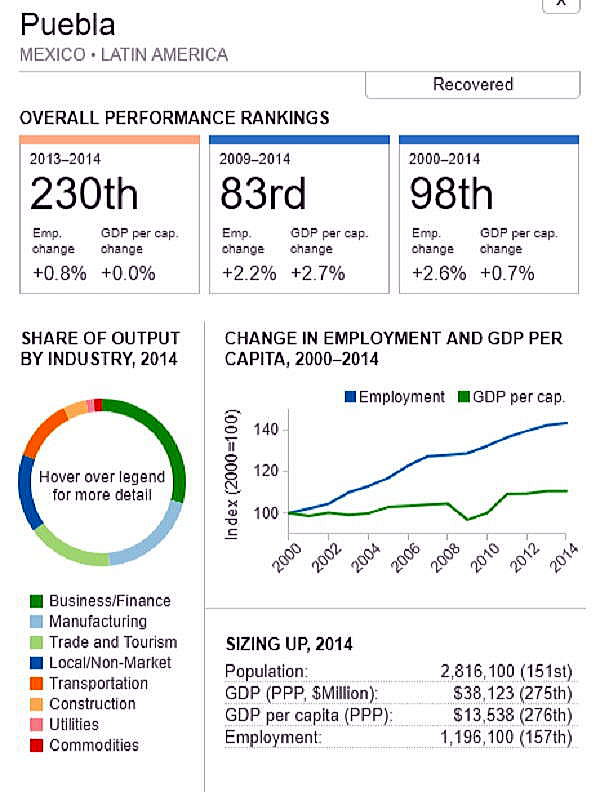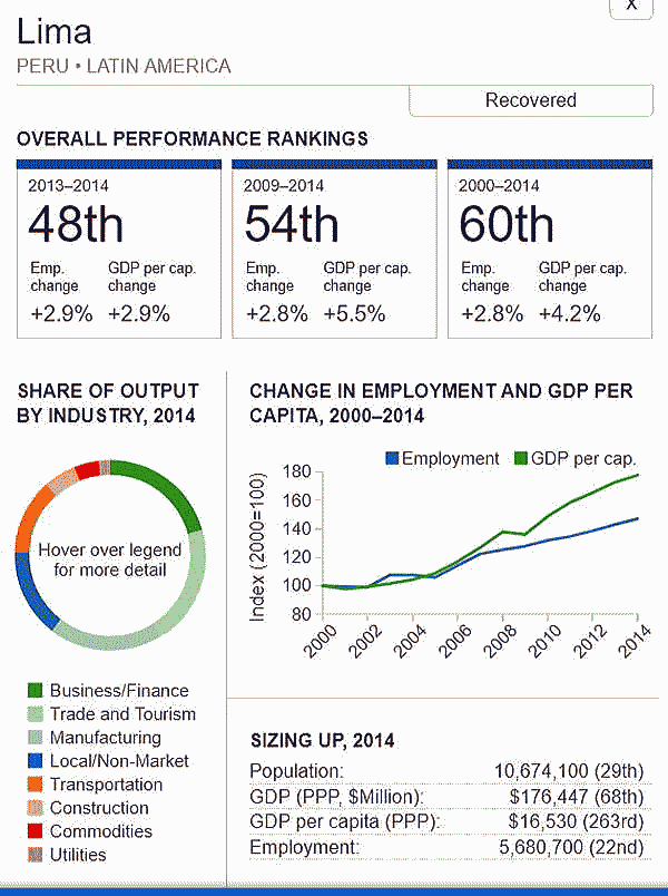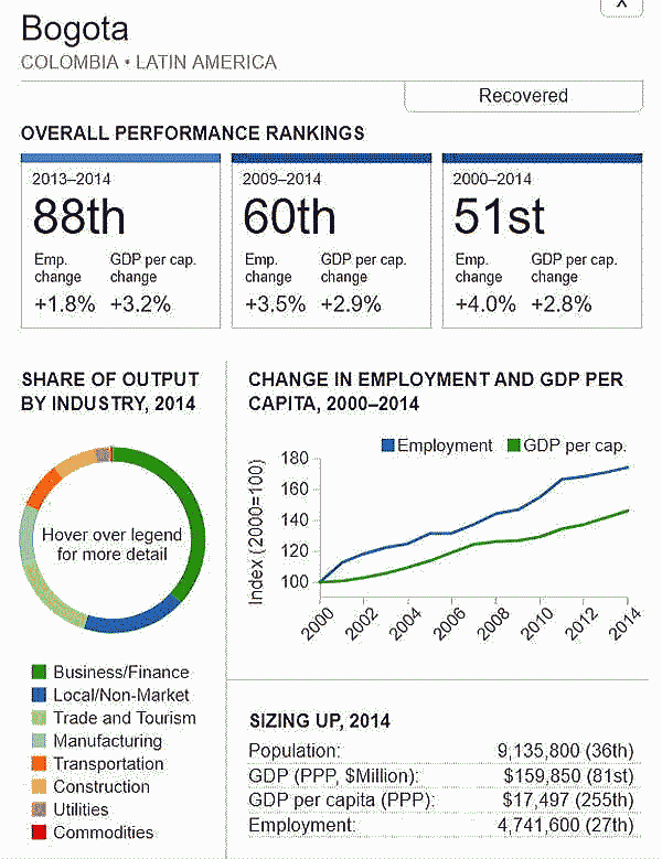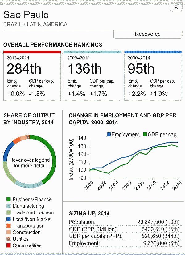 カナダ・中南米 オリジナル出典:米国ブルッキングス研究所 ここではカナダと中南米諸国の大都市圏について、調査結果(総合、2000年〜2014年)を見てみます。 ![]() 出典ブルッキングス研究所(米国)https://www.brookings.edu/research/global-metro-monitor/ ◆カナダ カナダ(全数、7都市圏) カナダの大都市圏はいずれも米国との国境沿いにあり東側の太平洋に近い都市圏の伸び率が高く、アメリカ東部に近い都市の伸び率は中位か低く、成熟社会化しています ![]() 出典ブルッキングス研究所(米国) <世界300都市経済圏ランクマップ> 総合・一人当たりGDP・雇用 カナダ エドモントン大都市圏(83位/300) ![]() カナダ カルガリー大都市圏(90位/300)..青山、池田 ![]() カナダ ケベックシティ度試験(103位/300)青山、池田 ![]() カナダ バンクーバー大都市圏(122位/300)..青山、池田 ![]() カナダ トロント都市圏(133位/300)..青山、池田 ![]() カナダ オタワ都市圏(140位/300) ![]() カナ_ ウィニペッグ都市圏(151位/300) ![]() カナダ モントリオール都市圏(159位/300)..青山、池田 ![]() 。 中米 中米(全数、4) ![]() 出典ブルッキングス研究所(米国) メキシコ プエブラ都市圏(98位/300) ![]() メキシコ モンテレー都市圏(109位/300) ![]() メキシコ グアダラハラ大都市圏(120位/300) ![]() メキシコ メキシコシティー大都市圏(130位/300) 青山 ![]() 南米 ![]() 南米(全数、18) ペルー リマ都市圏(60位/300) ![]() コロンビア メディリン都市圏(63位/300) ![]() アルゼンチン ブエノスアイレス都市圏(87位/300) ![]() ブラジル ブラジリア都市圏(71位/300) ![]() ブラジル ベロオリゾンテ都市圏(75位/300) ![]() ブラジル レシフェ都市圏(76位/300) ![]() ブラジル クリティバ都市圏(82位/300) ![]() ブラジル グランデ・ヴィトーリア都市圏(86位/300) ![]() ブラジル サンパウロ都市圏(95位/300) ![]() ブラジル フォルタレザ都市圏(101位/300) ![]() ブラジル・キャンピナス都市圏(102位/300) ![]() ブラジル・サルバドール都市圏(115位/300) ![]() ブラジル リオデジャネイロ都市圏(127位/300) ![]() ブラジル ポートアレグレ都市圏(131位/300) ![]() ヴェネズエラ カラカス都市圏(126位/300) ![]() コロンビア ボゴタ都市圏(51位/300) ![]() チリ サンチアゴ都市圏(74位/300) ![]() プエルトリコ サンフアン都市圏(297位/300) ![]() 以上、カナダと中南米の都市圏の順位を見てきましたが、おおよそ以下のことが言えます。 カナダ、メキシコは、すべての都市圏が中位の位置にあり、南米諸国は、最上位グループ、第二位グループにあることが分かる。 <カナダ、中南米地域都市圏の分布> 1位から 60位 コロンビア、ペルー 61位から120位 アルゼンチン、ベネズエラ、ブラジル 121位から180位 カナダ、メキシコ、コロンビア 181位から240位 該当なし 241位から300位 該当なし つづく G7へ