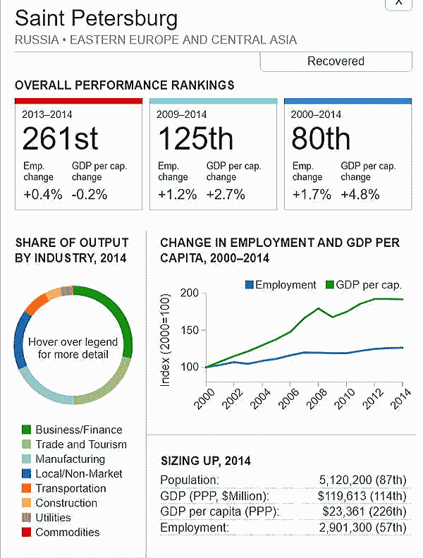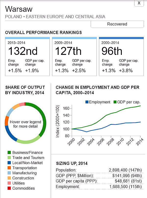 東欧・北欧 オリジナル出典:米国ブルッキングス研究所 ここでは東欧、北欧諸国の都市圏について、調査結果(総合、2000年〜2014年)を見てみます。 ![]() 出典ブルッキングス研究所(米国)https://www.brookings.edu/research/global-metro-monitor/ ![]() 出典ブルッキングス研究所(米国) <世界300都市経済圏ランクマップ> 総合・一人当たりGDP・雇用 東欧 ハンガリー ブダペスト都市圏(142位/300) ![]() ポーランド ワルシャワ都市圏(96位/300) ![]() ポーランド クラクフ都市圏(112位/300)青山、池田 ![]() ポーランド カトヴィツェ - オストラバ都市圏(136位/300) ![]() ブルガリア ソフィア都市圏(49位/300) ![]() ルーマニア ブカレスト都市圏(77位/300) ![]() ロシア サンクトペテルブルグ都市圏(80位/300) ![]() ロシア モスクワ大都市圏(81位/300) ![]() 北欧 デンマーク コペンハーゲン・マルモ都市圏(227位/300) 青山・池田 ![]() スウーデン ストックホルム都市圏(147位/300) ![]() スウェーデン ヨーテボリ都市圏(152位/300) ![]() フィンランド ヘルシンキ都市圏(201位/300) ![]() ノルウェー オスロ都市圏(135位/300) ![]() つづく 米国へ