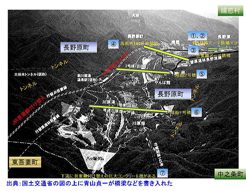 (1)下久保ダム・神流湖 (2)JAL墜落現場再アタック (3)鬼押出し園-1 (4)鬼押出し園-2 (5)八ッ場ダム工事7-1 (6)八ッ場ダム工事-2 (7)八ッ場ダム工事、温泉移設 (8)野反湖とキスゲ (9)碓氷峠とおぎのや 私たちは過去30回以上、八ッ場ダムの工事現場に足を運び写真、動画で工事の実態を撮影している。そろそろ一本の動画などにし国民そして世界各国のひとびとに世紀の愚行を知らせたいと思っている。 私達の環境総合研究所(東京都目黒区)では、単に現場近くに別荘があるので行くたびに現場を見に行くだけでなく、八ッ場ダムの集水域全体を対象とした水象動態シミュレーションモデルを研究開発しており、学会などにも論文発表している。下は環境行政改革フォーラムの予稿集に掲載した論文である。 ※ 青山 貞一(武蔵工業大学環境情報学部)、鷹取敦(環境総合研究所) 計画高水シミュレーションシステムの研究開発 〜八ッ場ダム計画地域を事例に〜(経過の概要報告) 環境行政改革フォーラム論文集 Vol.1 No.2 2009年秋、民主党の政権交代に一大シンボルとなった八ッ場ダム工事中止だが、現場は自然環境が破壊されたい放題、税金、公金の使いたい放題となっている。地域の人間の社会的関係もズタズタ、巨大公共事業が地方、地域を破壊する典型例であると言える。 ..... 7月17日の午後、鬼押出し園を見学した後、浅間牧場で一休みした。このころ小雨が降り出した。 雨が降り出したが、青山、池田にとっては勝手知ったる地元ということもあり、斎藤真実さんをご案内し群馬県長野原町でここ10年以上行われている八ッ場ダムの工事現場にでかけた。 雨は降ったり止んだりしていたが、霧が出て地域は水墨画のような様相を呈していた。 八ッ場ダム工事は当初予算が4600億円と日本最大級であったが、ダム本体工事以前にほぼ全額を使い果たし、さらに道路特別会計からも相当額の資金を供出し、吾妻渓谷の両側に巨大な道路、橋梁、トンネル、軌道を整備してきた。 とりわけ橋梁の数は膨大で、国道145号線バイパス道路用橋梁(以下の@、Aのアーチ型鉄橋)、吾妻線付け替えのための橋梁(以下のB)、国道145号線バイパスの高規格道路用橋梁(以下のC)、一般県道橋梁湖面2号橋(以下のD)、一般県道橋梁湖面1号橋(以下のE)、それに下図にはないが東吾妻町の吾妻線付け替えのための橋梁(以下F)と全部で7つもの巨大橋梁を吾妻渓谷の両岸を結ぶためにつくってきた。 今回現地視察すると、7本目の巨大橋梁がほぼ完成していた。これは下図のEに相当する橋梁である。正式名称は、一般県道川原畑大戸線 湖面1号橋である。 下の橋梁位置を入れた立体地図は青山貞一のオリジナル図だが、これを見ただけで道路、橋梁、トンネル、鉄道付け替えなど、ダム建設がなければすべて一切不要なものであり、環境破壊と税金・公金の無駄遣いであるかが分かるというものである! |