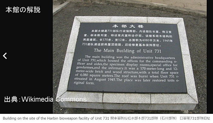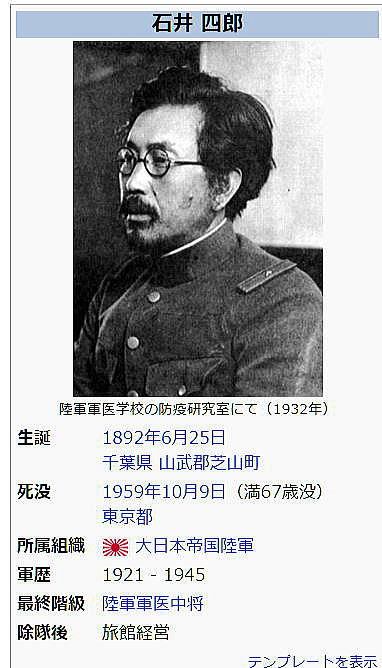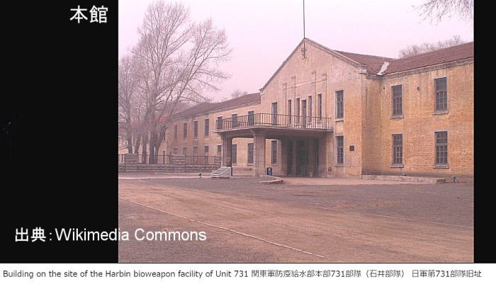 ここでは、2017年8月にNHKから放映された「731部隊の真実」ドキュメント以前の731部隊についての記録、記述を整理しています。出典は主にWikipediaの731部隊と石井 四郎、テレビ朝日ザ・スクープ(731部隊・細菌戦の真実)はじめWikimedia、Tripadvisorの写真などです。 そのうえで、NHK「731部隊の真実」ドキュメントにより新たに明らかになったことについて紹介したいと第二編で考えます。 ◆731部隊の概要 731部隊は、第二次世界大戦期の大日本帝国陸軍に存在した研究機関のひとつを意味します。正式名称は関東軍防疫給水部本部でああり、731部隊の名は、その秘匿名称(通称号)である満州第七三一部隊の略です。 七三一部隊跡は中国語では侵華日軍七三一部隊遺址となります。中国での正式住所は、黒竜江省哈爾賓(ハルビン)市平房区新疆大街25号となります。以下はグーグルマップで検索した現地の位置です。 ![]() ハルビン市がある中国黒竜江省の位置 出典:Wikimedia Commons ![]() ハルビン市がある中国黒竜江省の位置 出典:Wikimedia Commons 下は満州国の鉄道路線とハルビンの位置。 ![]() 満州国の鉄道路線とハルビンの位置 出典:Wikipediaの地図より青山貞一が作成 正式な住所は、黒龍江省哈爾浜市平房区新疆大街21号。 ![]() 731部隊関連施設の位置 出典:ゴーグルマップ ![]() 731部隊関連施設の位置 出典:ゴーグルマップ(衛星写真) 満州に拠点をおいて、防疫給水の名のとおり兵士の感染症予防や、そのための衛生的な給水体制の研究を主任務とすると同時に、細菌戦に使用する生物兵器の研究・開発機関でもありました[1]。そのために人体実験[2][3]や、生物兵器の実戦的使用[4][5]を行っていたとされています。 ![]() 証拠隠滅で破壊される前の731部隊司令部 出典:Wikimedia Commons ![]() 証拠隠滅で破壊される前の731部隊司令部 出典;Тайна ≪Отряда 731≫ ![]() 731部隊司令部本館の入り口 ![]() 731部隊司令部本館の入り口 (トリップアドバイザー提供) ![]() 731部隊本部大楼 (トリップアドバイザー提供) ![]() 731部隊司令部本館の解説板 現在、中国黒竜江省哈爾賓市には731部隊に関連した陳列館があります。以下の写真は陳列館の外観と内部の一例です。 ◆石井 四郎(1892年6月25日 - 1959年10月9日) ![]() 出典:Wikipedia 石井四郎は、日本の陸軍軍人、軍医。関東軍防疫給水部長、第1軍軍医部長を歴任。最終階級は陸軍軍医中将。功四級、医学博士。防疫給水部731部隊の創設者として軍隊や戦災者、現地の病人に飲料水を提供し、感染症予防のワクチンを投与するなどの防疫活動や、連合国軍の対日本細菌戦に対抗する研究を行ったとされ、森村誠一著の『悪魔の飽食』の中では、人体実験を中国で行ったと告発されている。 1933年(昭和8年)3月、陸軍軍医学校において細菌学を教育する。 1934年(昭和9年)3月30日までの半年間、再び満洲に滞在。 1935年(昭和10年)、陸軍軍医中佐(二等軍医正)に昇進。 1936年(昭和11年)、東郷部隊が正式な部隊となる。東郷部隊を母体として関東軍防疫給水部を編成。防疫給水部は、戦災や災害時の防疫、および清潔な飲料水を兵士や被災者に供給する部署である。帝国陸軍の習慣によって部隊長の名を冠した「石井部隊」の通称名で呼ばれる。 1938年(昭和13年)8月、陸軍軍医大佐(一等軍医正)に昇進。 1939年(昭和14年)5月11日、ノモンハン事件勃発により、野戦防疫給水部長として出動。7月8日から10日間の予定で海拉爾、将軍廟方面にて防疫給水部隊の指導にあたる。細菌戦を実戦する。 10月1日、ノモンハンでの石井部隊の防疫成果が認められ、関東軍防疫給水部は第6軍司令官だった荻洲立兵中将から衛生部隊としては史上初の感状を授与され、石井の顔写真付きで新聞報道でも取り上げられた。 1941年(昭和16年)3月、陸軍軍医少将に昇進。4月、陸軍の全部隊を対象に秘匿名称である通称号が導入されたのに伴い、関東軍防疫給水部本部は「満洲第731部隊」の通称号が割り当てられる。 1942年(昭和17年)8月1日、関東軍防疫給水部を離れる。 常石敬一によれば、731部隊が石井の指揮の下で細菌兵器を実戦で使用していたと主張している。 追記 石井四郎は 四郎 というくらいで四男、そして、次男と、三男も731部隊で働いていた。長男は日露戦争で戦死とある。 中国人の犠牲者の遺族が石井家を訪れたときの石井家の対応がケンモホロロであることがテレビ朝日のザ・スクープ取材班の追跡取材で分かっている。家族全員が戦争にかかわりかつ4人のうち3人の息子が731部隊というのももの凄い。 千葉県山武郡芝山町(加茂)の旧家主、父・石井桂と母・千代の間に四男として生まれる{ 長男・彪雄は日露戦争で戦死し、次男・剛男は陸軍嘱託で731部隊の特別班班長【マルタの管理】、 三男の三男(みつお)は陸軍技師で731部隊の動物班の班長}。 ![]() 千葉県山武郡芝山町(加茂) 出典:グーグルマップ ![]() 千葉県山武郡芝山町(加茂) 出典:731部隊 TBS知ってるつもり ![]() 石井四郎宅家跡地、女性は中国人遺族 出典:テレビ朝日ザ・スクープ(731部隊・細菌戦の真実) ![]() 石井