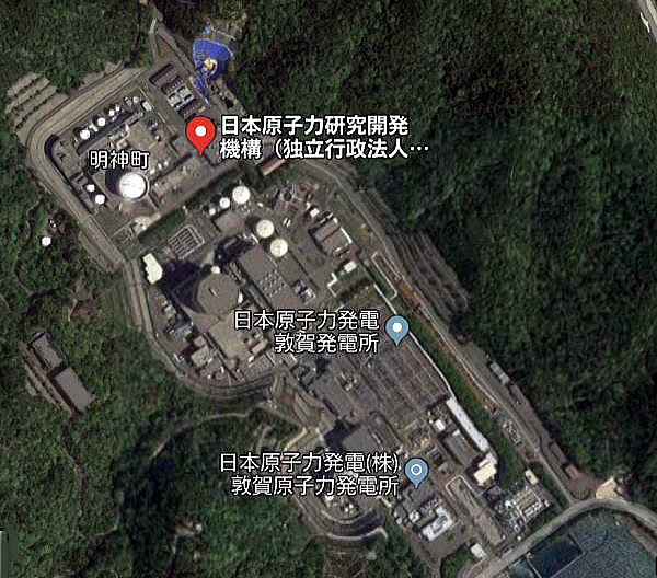 下はグーグルマップの衛星画像で見たふげんである。ふげんは北側にあり、中央と南側は日本原子力発電の敦賀原発である。