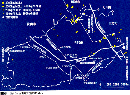<ほうれん草も十分高濃度である> 最高裁第一小法廷のテレビ朝日判決は、本質をそっちのけとしている点で問題である。 さらに言えば、最高裁が視聴者が受けた総合的印象をもとに、「白菜だけの1つのサンプルだけでは危険とはいえない」、とか「環境総研と摂南大の調査結果だけでは、地域の農作物全体が汚染されているとは言えない」と言っているが、そうであろうか。 私たちこの分野にいる研究者にとっては、以下に述べるようにほうれん草中のダイオキシン汚染濃度は、十分高濃度であり、それを報じたことが不法行為となり、損害賠償の対象となることは断じて許すことはできない。その主たる理由は、第一に、後述するように環境総合研究所や摂南大学宮田教授が提出したほうれん草の濃度は十分に高濃度であること、第二に行政が不作為を決め込む中、在野の研究者や調査機関がどこまでどれだけ調査、分析すれば最高裁の意にそう調査となるのかがまったく不明確な点である。 そもそも狭い地域に50カ所を超える焼却炉が林立している場所で栽培される農作物であることを考えれば、野菜から近海魚類顔負けの超高濃度ダイオキシンが検出されたこと自体、きわめて憂慮すべき事であり、早急に国、自治体、事業者が第三者に依頼し、実態を把握すべきと思える。これは昨今のBSE問題を見れば明らかである。 BSE問題は、一頭でも汚染牛が検出された場合、国、自治体、生産者などの事業者は安易に安全宣言など出せないばかりか、全数調査を行っている。 比喩的に言えば、危険性については、たとえ少ないサンプルであれ高濃度が検出されればそれを重視すべきであり、他方、安全性については、それを検証するためにはできる限り多数のサンプルが必要となるのではなかろうか。 ところで、後述するように、そもそもテレビ朝日で報道されたほうれん草のダイオキシン濃度は、全国平均の値より著しく高濃度であった。それらは昨年夏にEUで施行された食品ダイオキシン規制指針を大幅に超過している。 食の安全や消費者の立場に立てば、白菜(3.4pg-TEQ/g)や煎茶(3.6〜3.8pg-TEQ/g)の濃度が高いだけでなく、環境総研や摂南大が調査したほうれん草のダイオキシン濃度(0.64〜0.75pg-TEQ/g)も十分に高濃度なのである。 <当時の所沢周辺地域の実態> 図1に示すように、1997年〜1998年当時、所沢周辺地域には50カ所を超える産業廃棄物、一般廃棄物の焼却施設が集中して立地していた。このような地域、場所は世界広しといえど、おそらく所沢周辺地域しかなかったはずだ。 私たち環境総合研究所は、それよりはるか前、所沢市役所からの依頼により、これらの焼却施設や道路施設が地域の環境にもたらす大気汚染状況を調査する業務を受け、地域に入った。