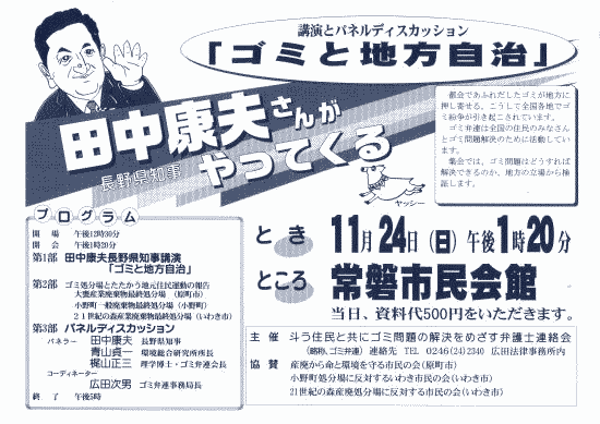 | 田中康夫長野県知事を迎え 「ゴミと地方自治シンポジウム」を開催! http://gomibenren.jp/ |