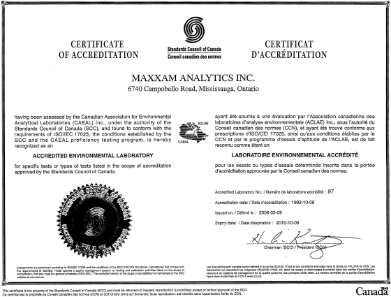 マクサム社は分析機関として 次の認定・認証を得ています。 本ホームページの著作権はMaxxam社及び環境総合研究所(東京都品川区)にあります。 無断転載を禁じます。